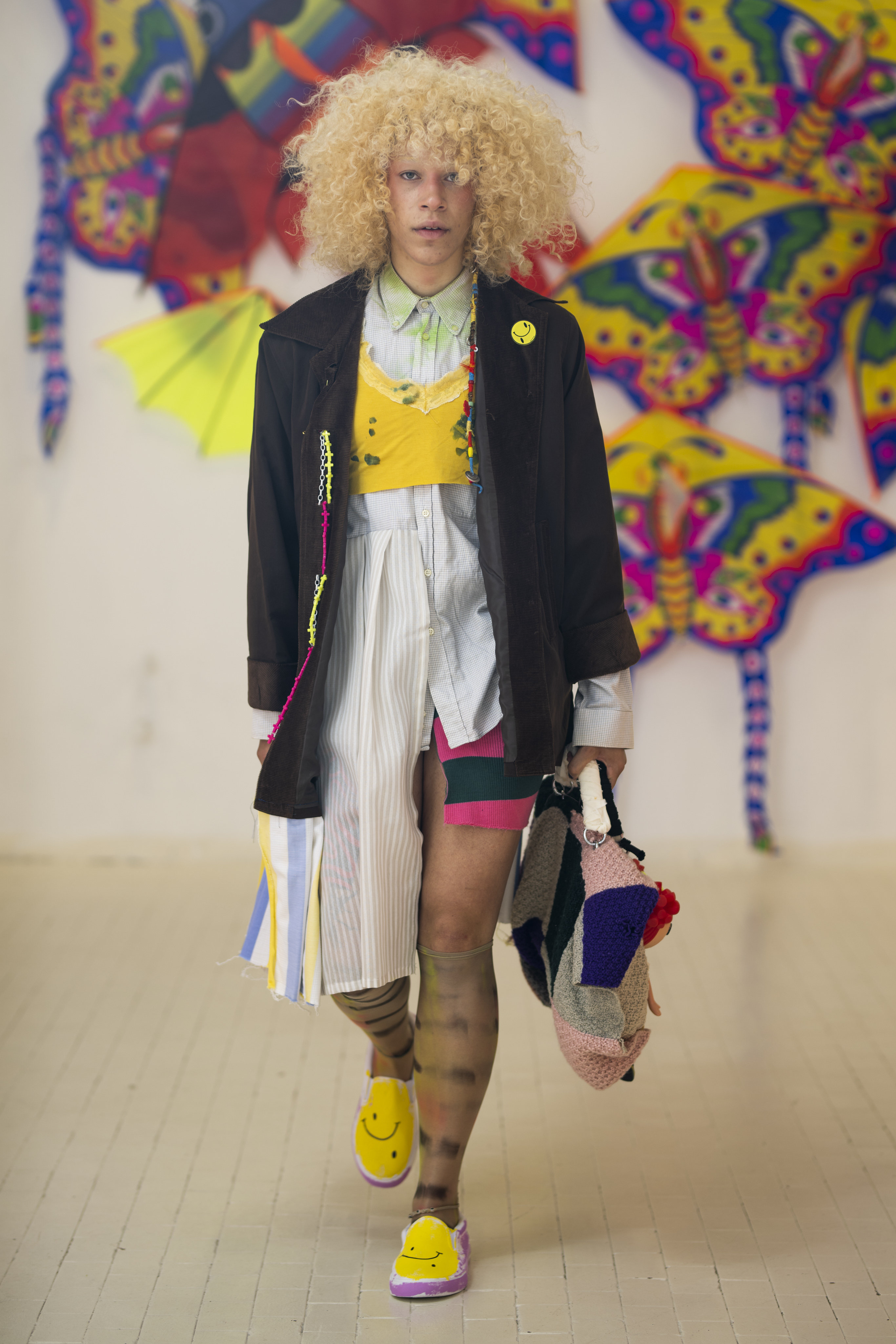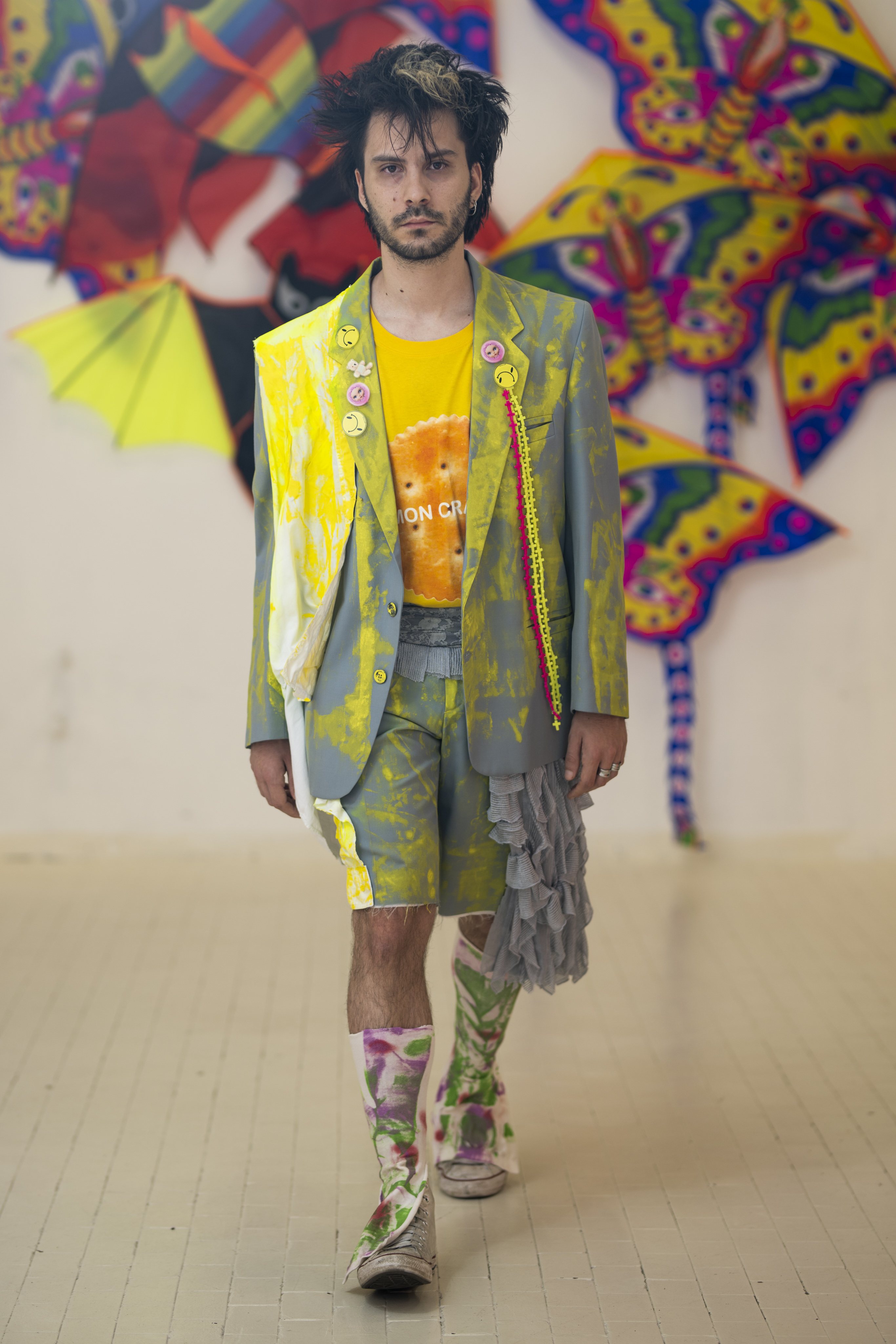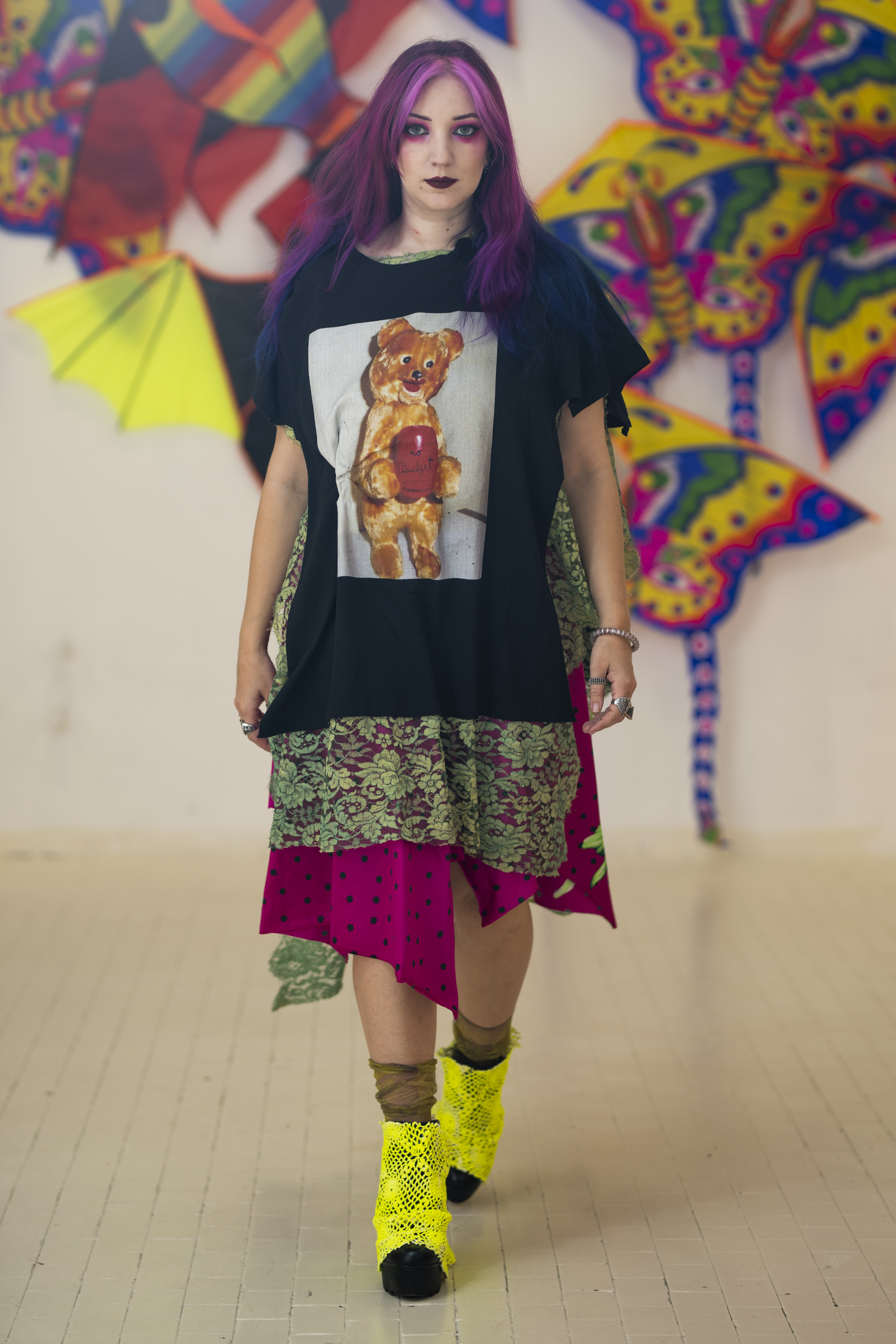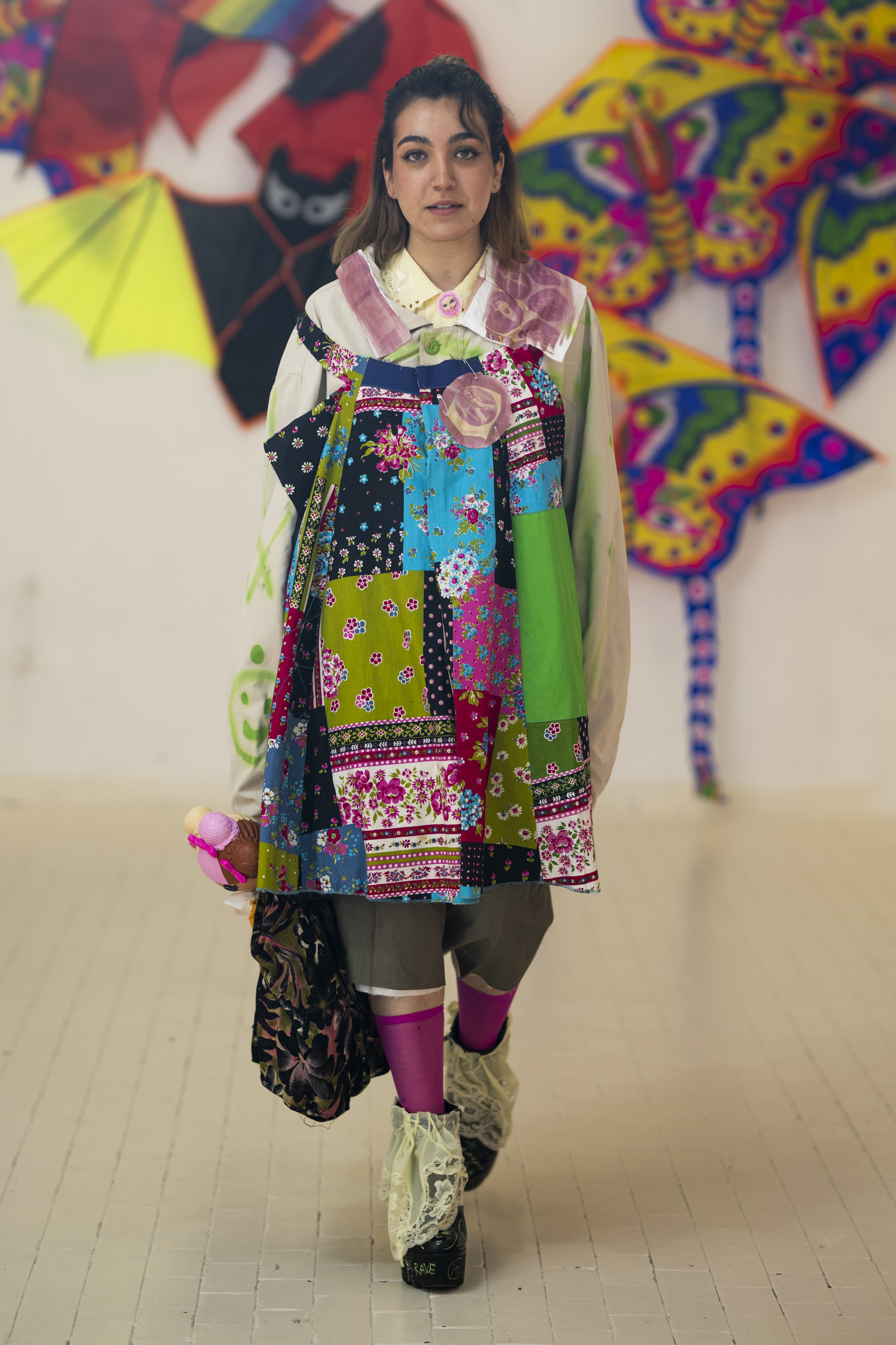 Questa storia è ben rappresentata dal caos felice di Simone Botte e Filippo Biraghi, un mondo sottosopra fatto da centrini sulle scarpe, rosari al posto di cravatte, orli non finiti, spille e balze colorate. Partendo dall’Io bambino, dall’infanzia e da quella giocosità piano piano viene svelato un sottotesto alquanto inquietante di stratificazioni e citazioni punk.