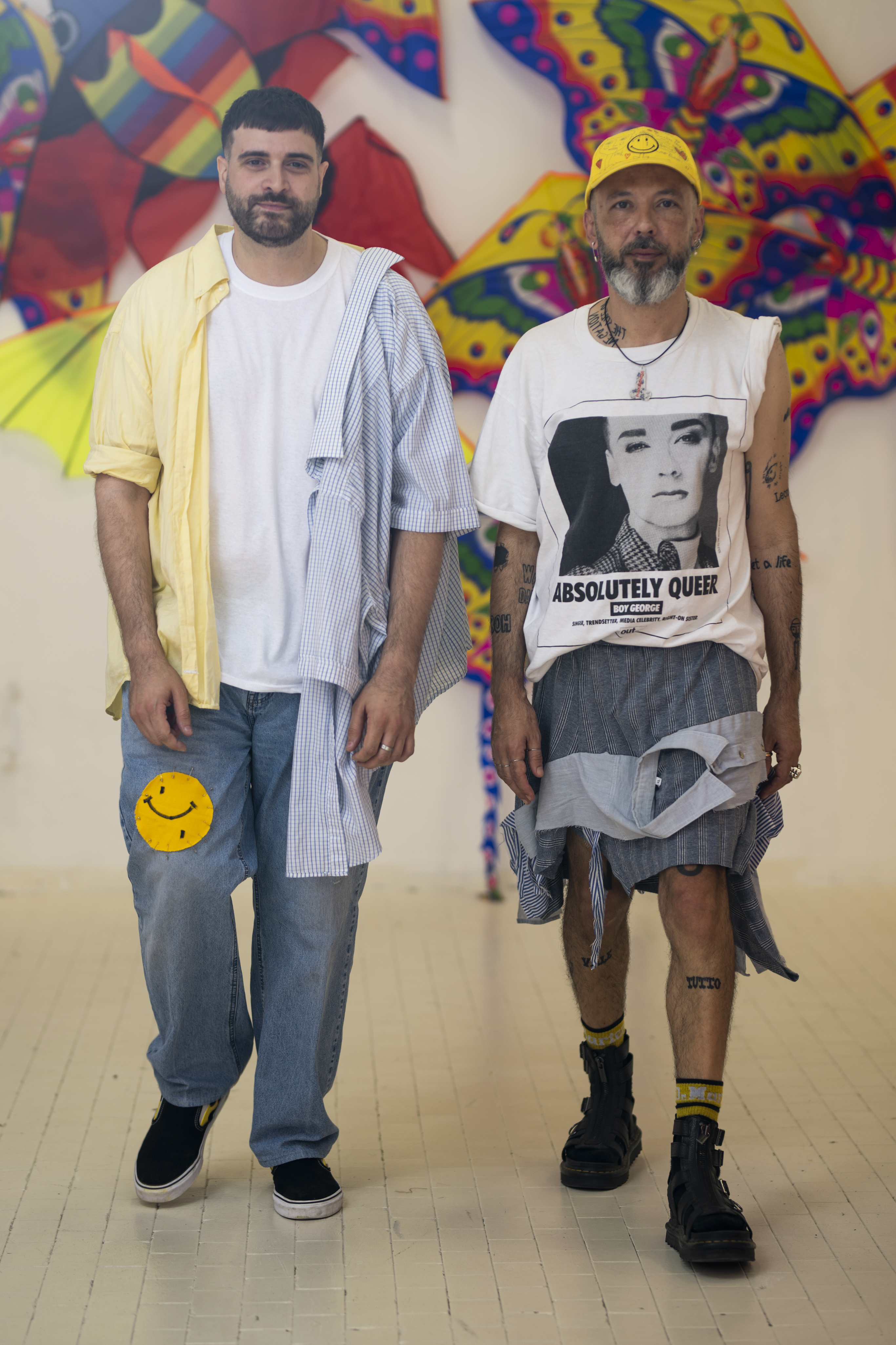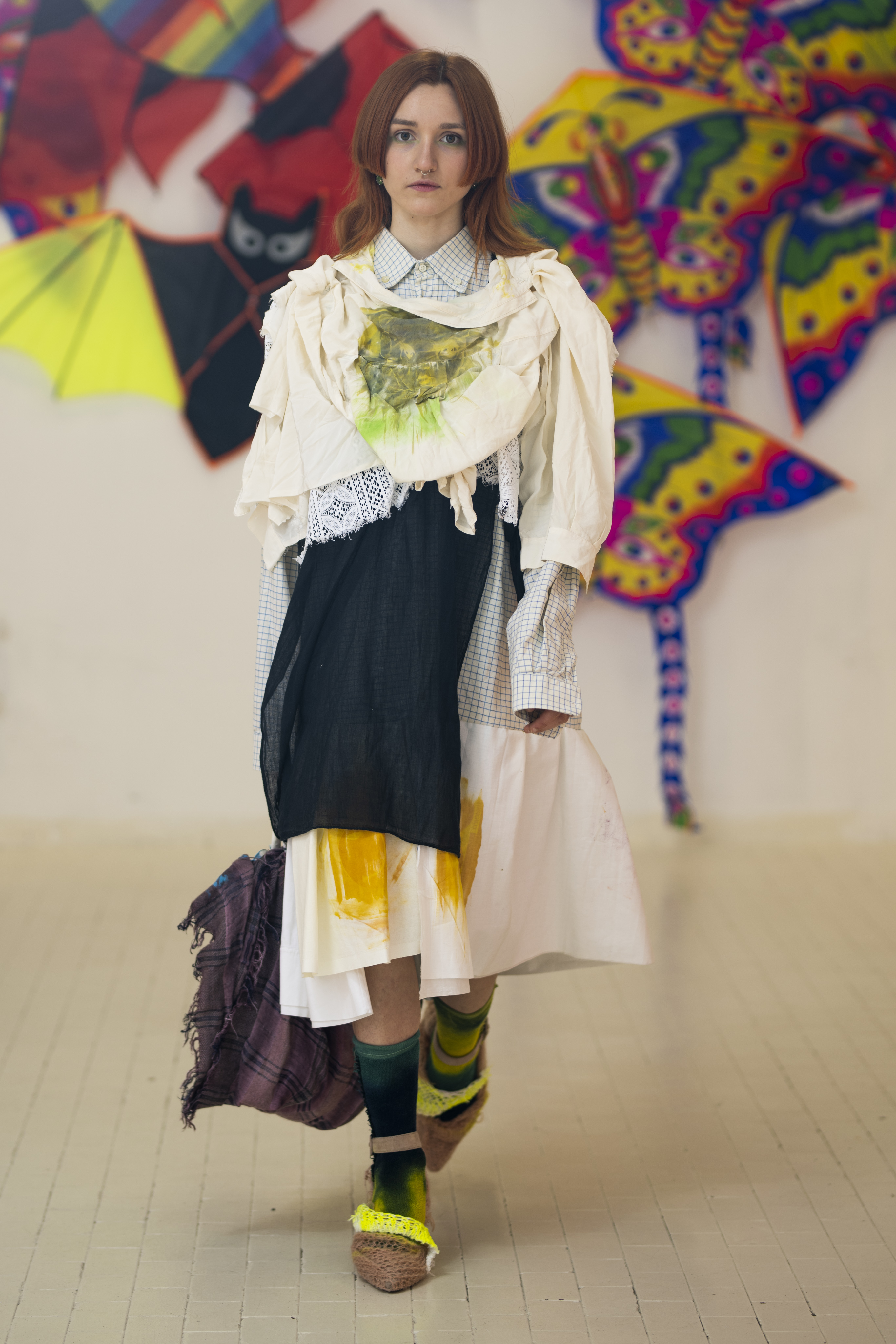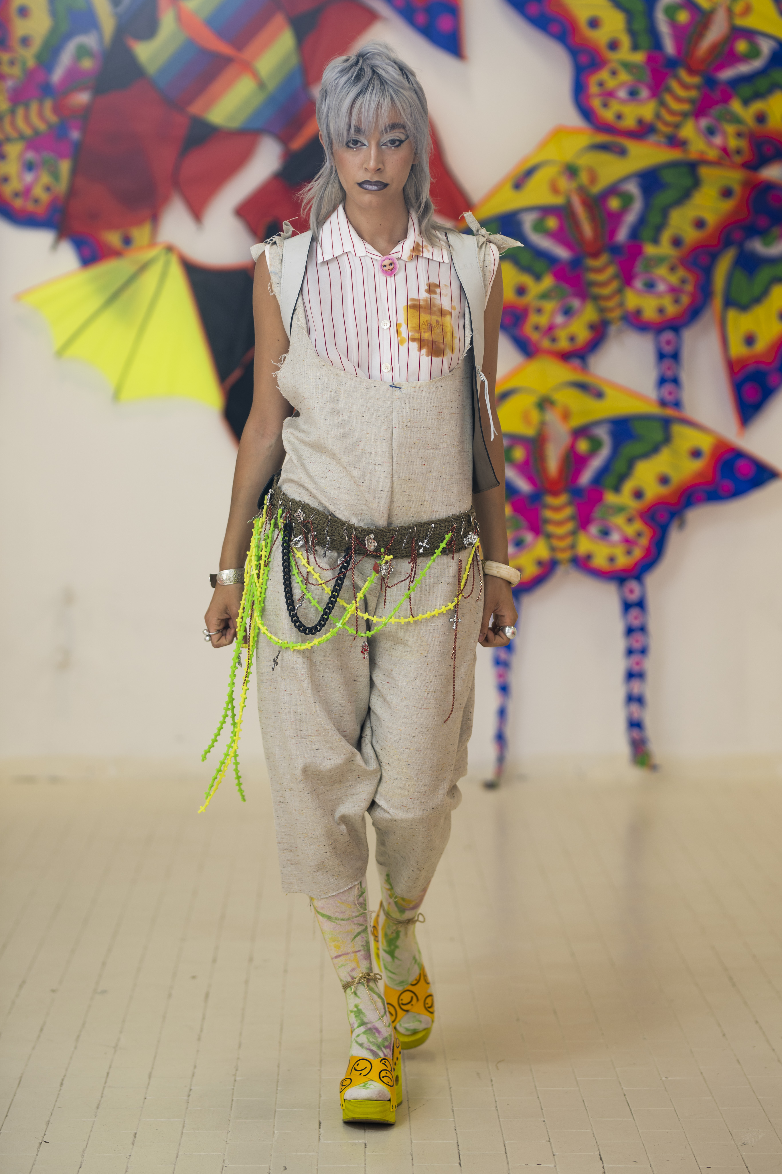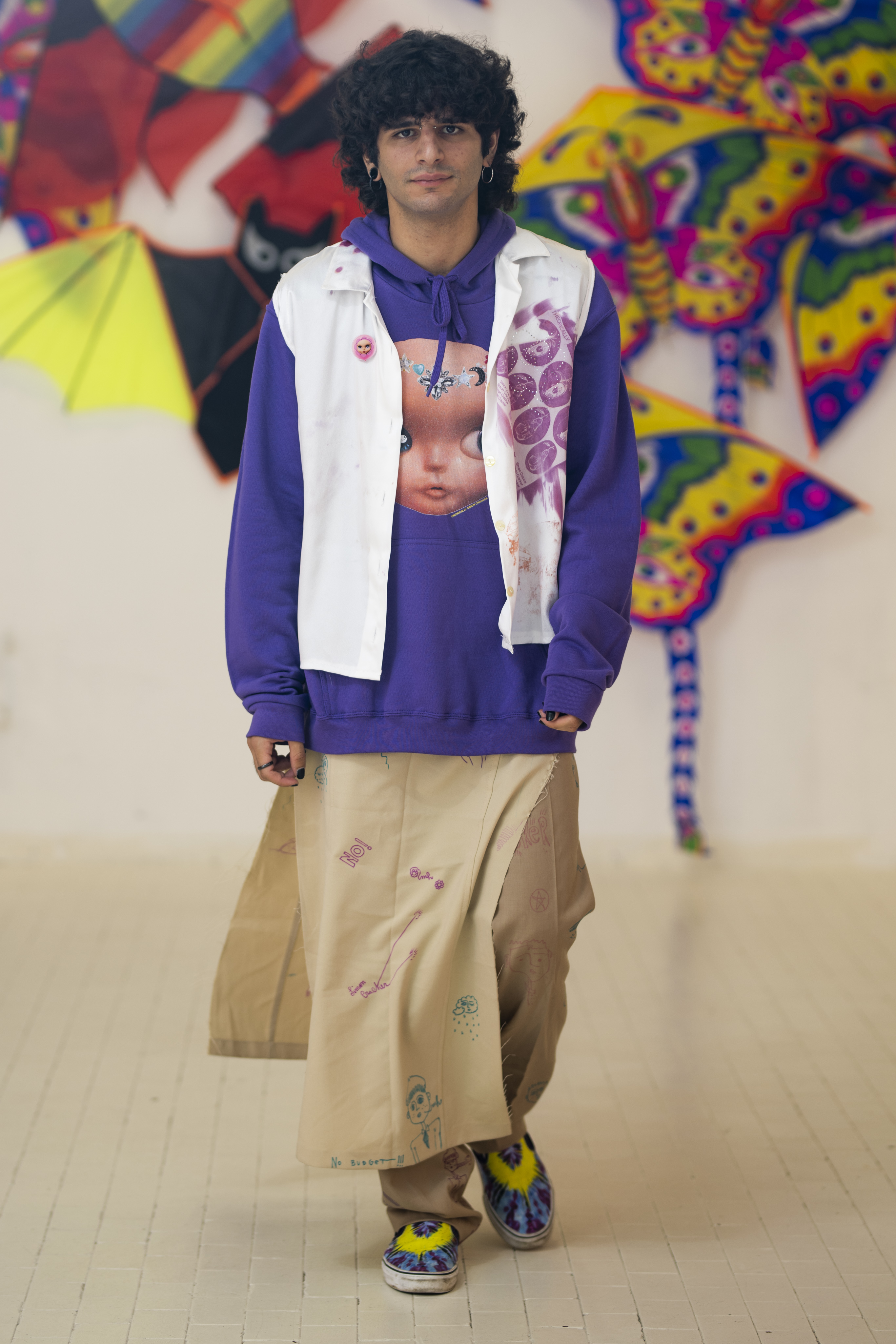 Questa storia è ben rappresentata dal caos felice di Simone Botte e Filippo Biraghi, un mondo sottosopra fatto da centrini sulle scarpe, rosari al posto di cravatte, orli non finiti, spille e balze colorate. Partendo dall’Io bambino, dall’infanzia e da quella giocosità piano piano viene svelato un sottotesto alquanto inquietante di stratificazioni e citazioni punk.