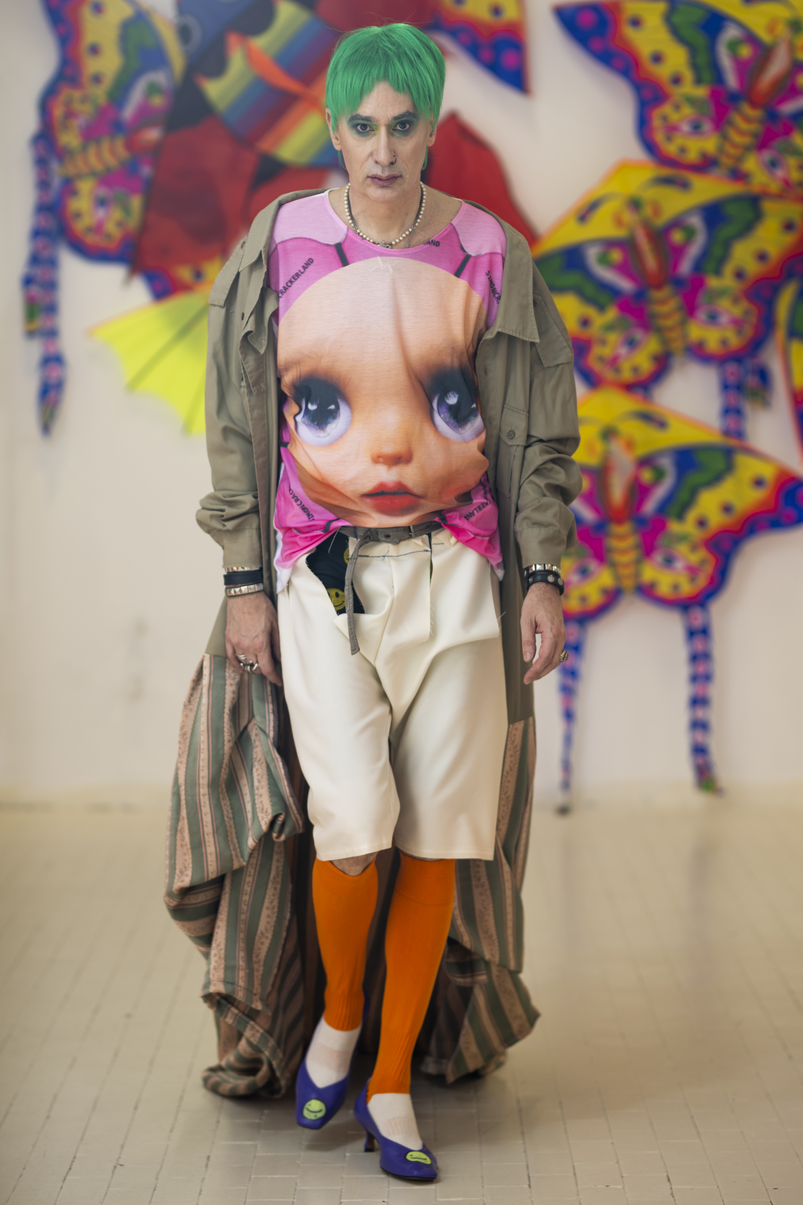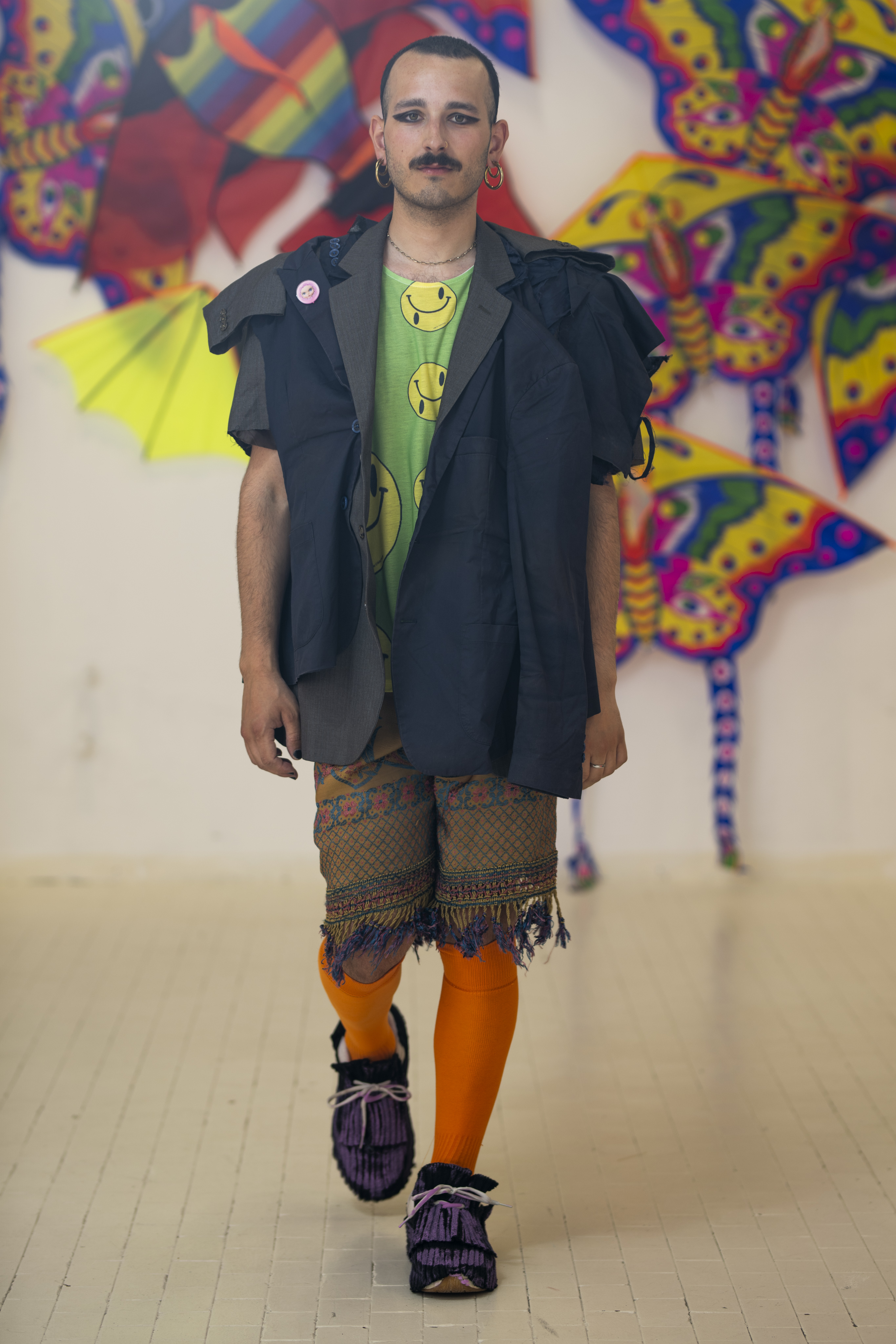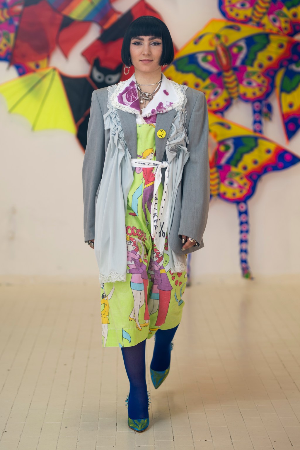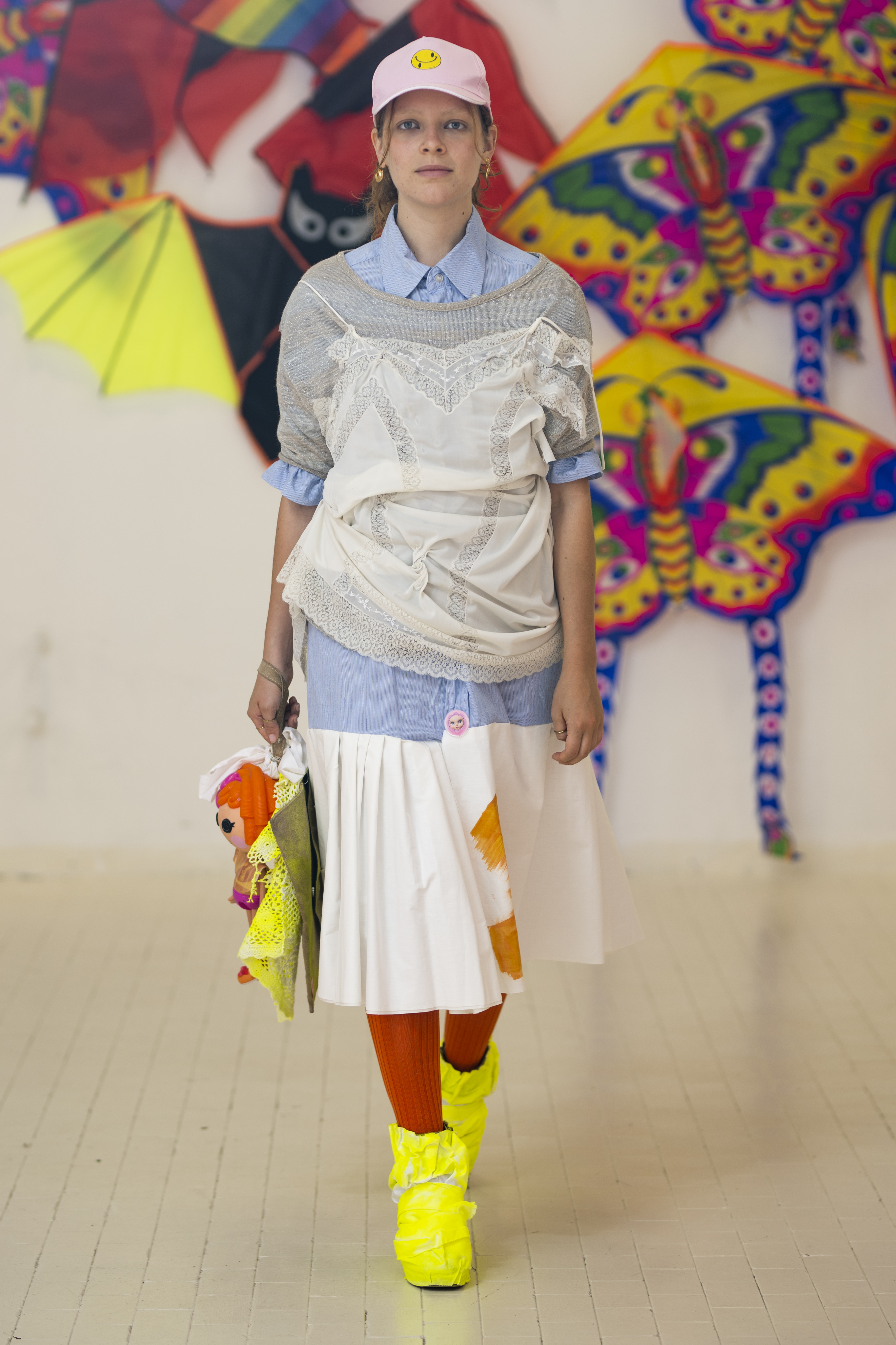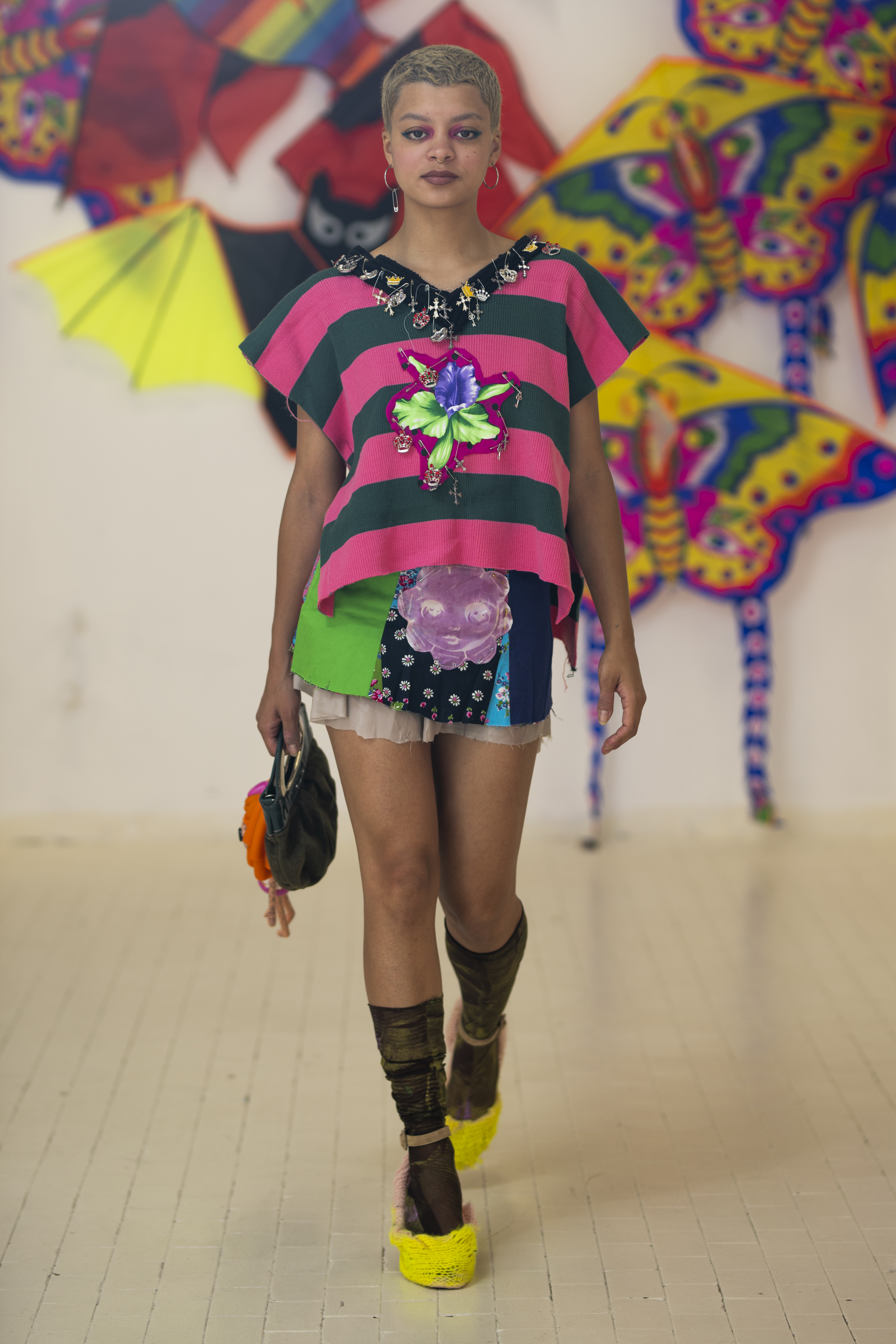 Questa storia è ben rappresentata dal caos felice di Simone Botte e Filippo Biraghi, un mondo sottosopra fatto da centrini sulle scarpe, rosari al posto di cravatte, orli non finiti, spille e balze colorate. Partendo dall’Io bambino, dall’infanzia e da quella giocosità piano piano viene svelato un sottotesto alquanto inquietante di stratificazioni e citazioni punk.