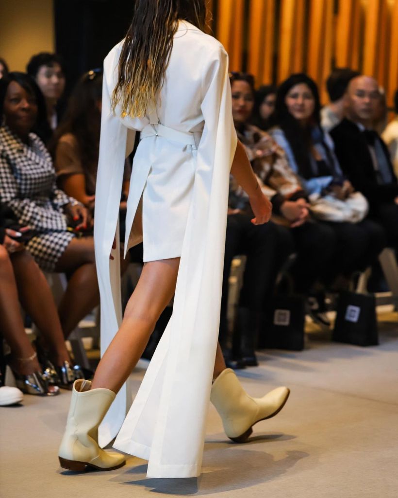 La prima a sfilare è stata la designer Suzanne Harper, fondatrice del brand di calzature A Perfect Jane. La sua mission è quella di dimostrare al mondo che moda e sostenibilità possono andare d’accordo senza utilizzare animali, poiché i loro stivali sono realizzati in pelle di mela e sono 100% vegani.