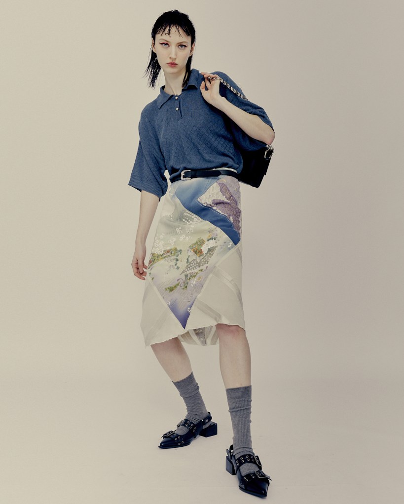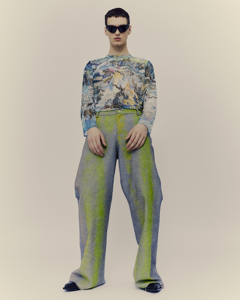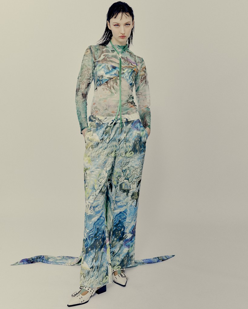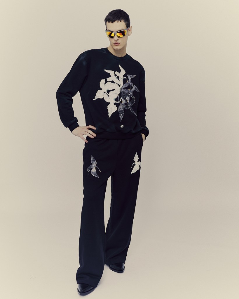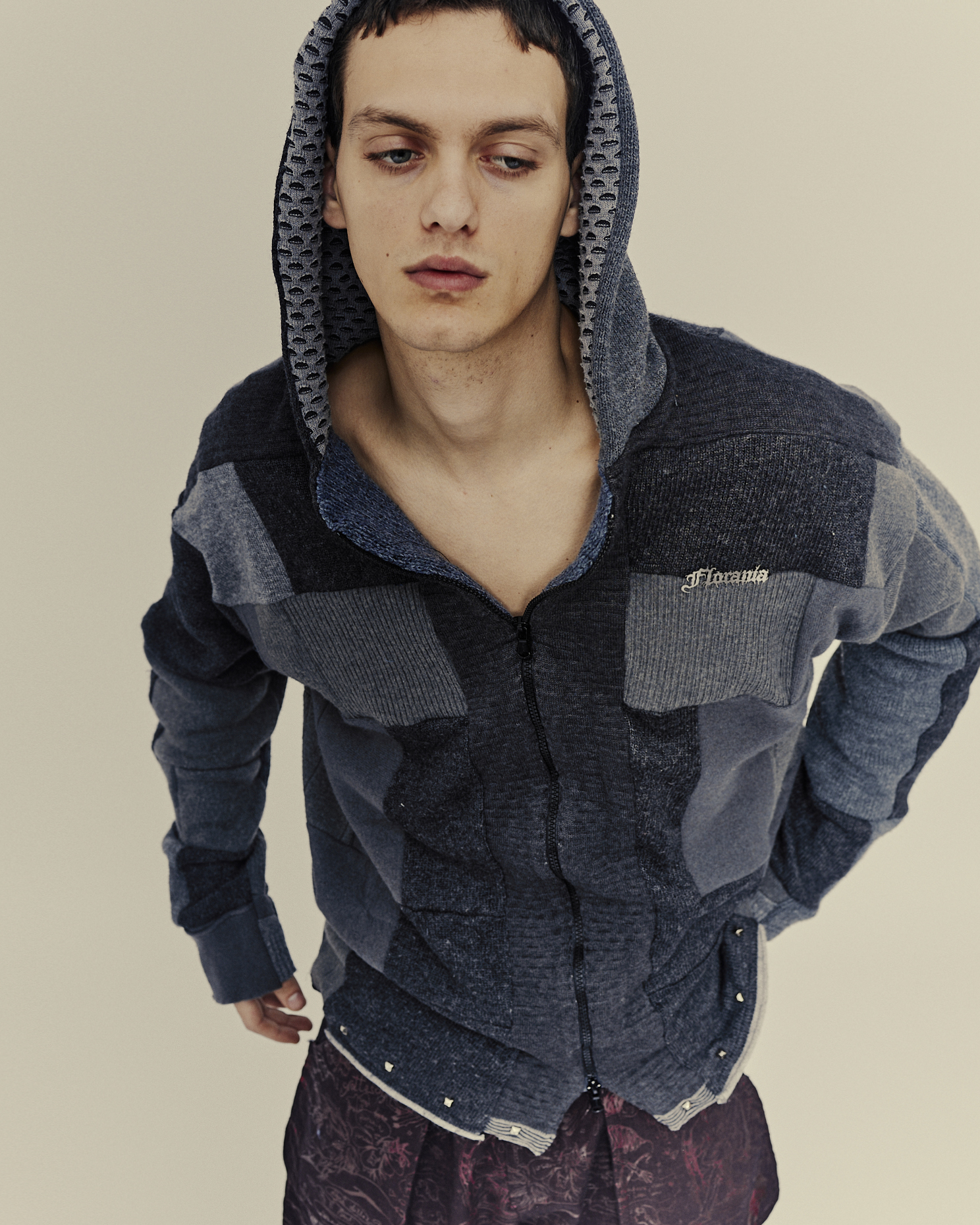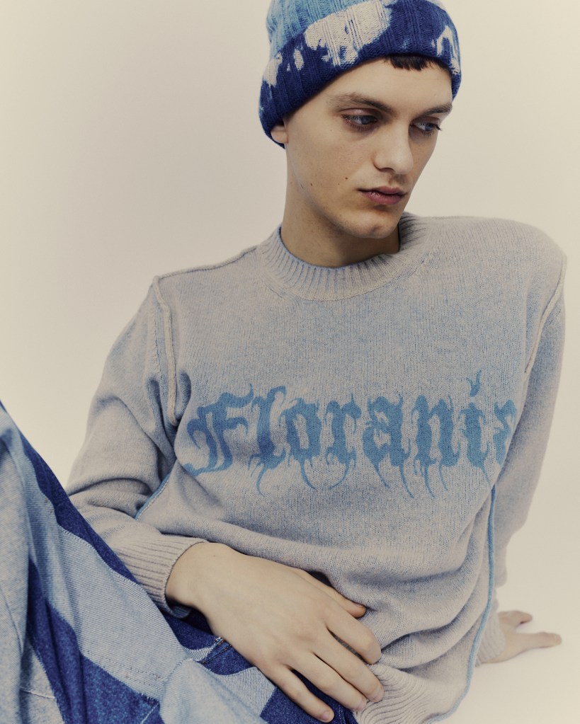 Potremmo parlare di un neoromanticismo punk in cui i personaggi di Florania si ispirano al lavoro del costumista Michiko Kitamura nel film “Ichi The Killer” (Takashi Miike, 2001): dalla sua interpretazione sfocata delle norme di genere nell’abbigliamento alla sperimentazione nei tessuti e nel design. Le stampe dipinte a mano con acquarelli evocano paesaggi grotteschi e naturali con figure misteriose come streghe e spiriti, conducendo ad una realtà alternativa, forse migliore della nostra quotidianità. Tra i capi proposti vediamo capotti e giacche sartoriali, completi in maglia con patchwork, polo e gonne midi, maglioni e accessori in cachemire riciclato con tinture sperimentali, sottovesti in collage creati da camicie da notte, kimoni vintage e denim aerografati. Nuovo inserimento sono gli articoli streetwear, come felpe con cappuccio e t-shirt, personalizzate da loghi e dipinti; tutti capi prodotti da SPAARKD, una divisione di Pangaia che ha confermato la collaborazione con il giovane marchio indipendente. Nuovi anche gli accessori, progettati in collaborazione con la designer di gioielli Margherita Potenza, che ha creato elementi metallici decostruiti, come chiusure per borse, cravatte punk e cinture.