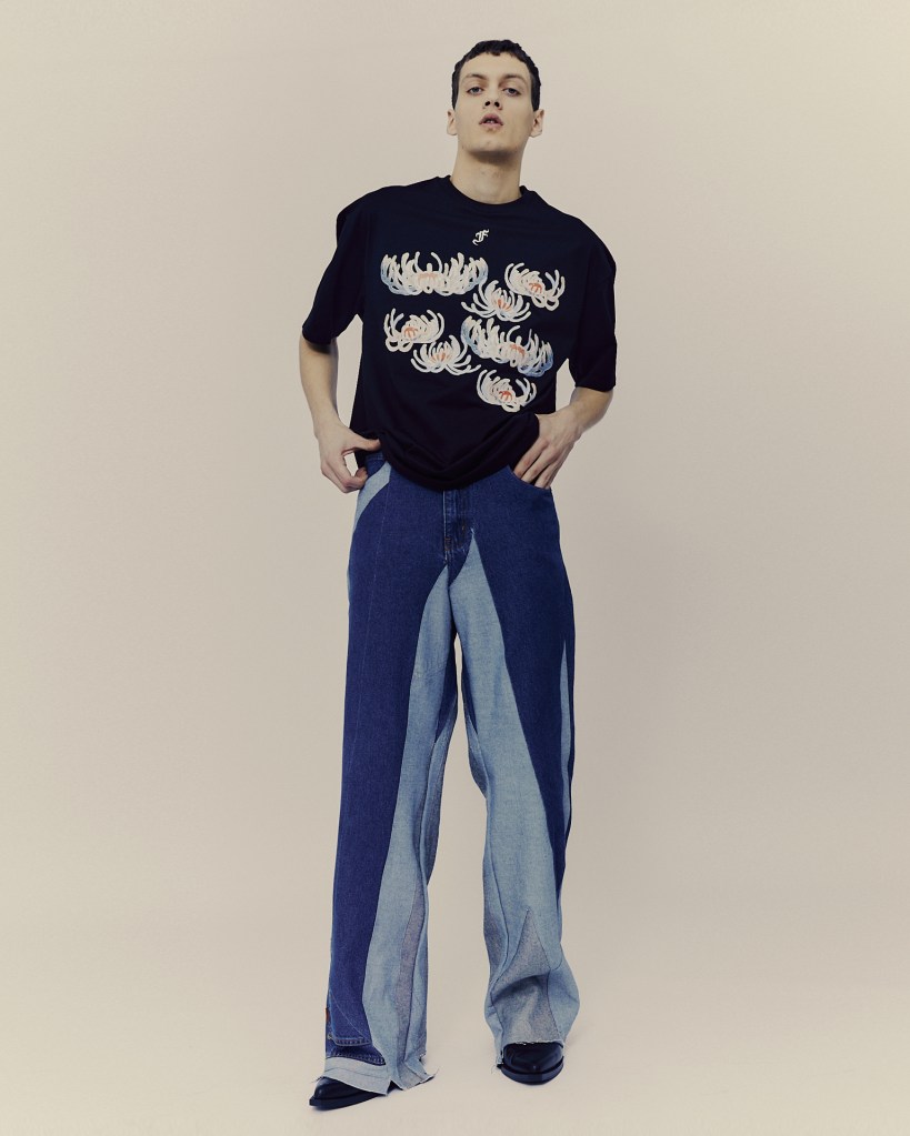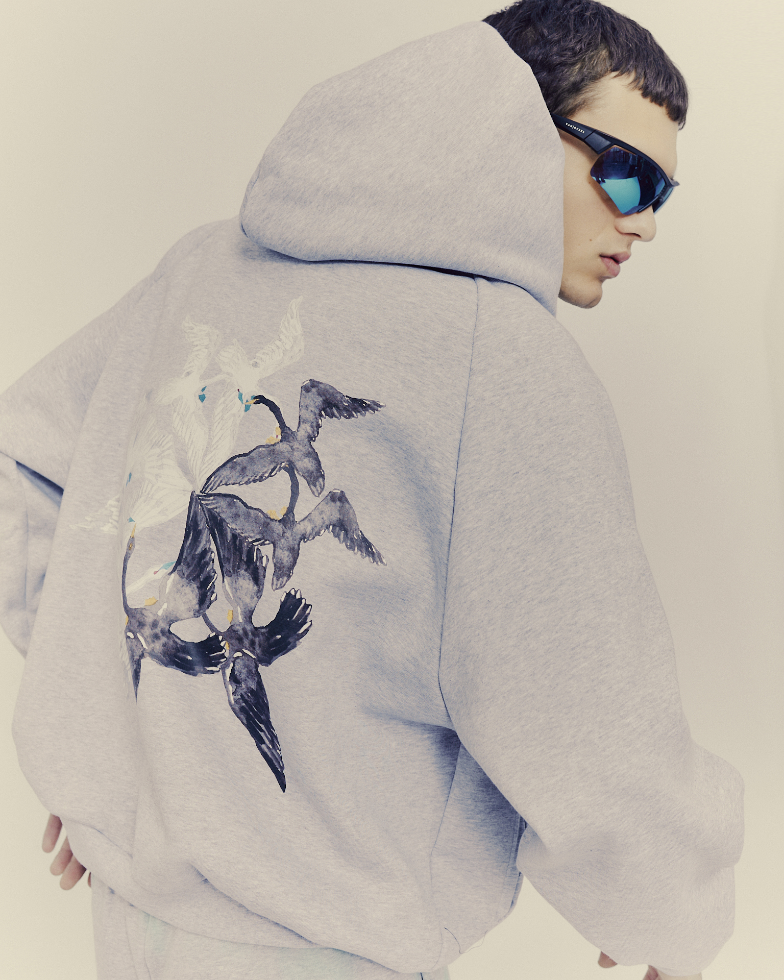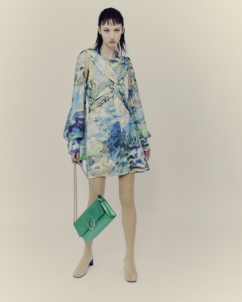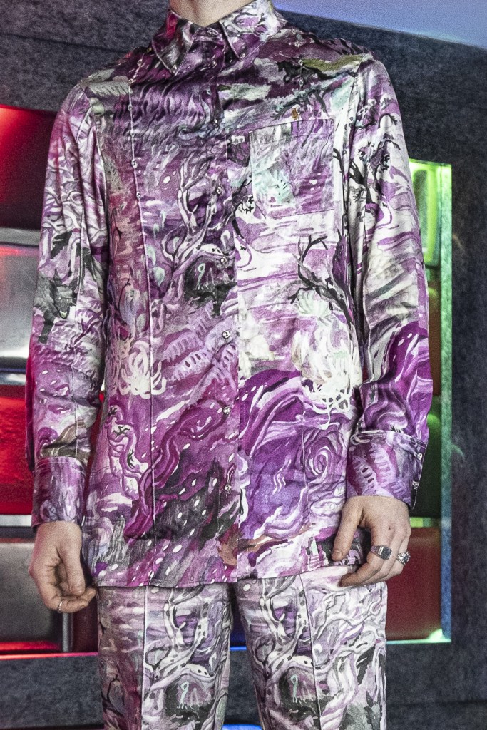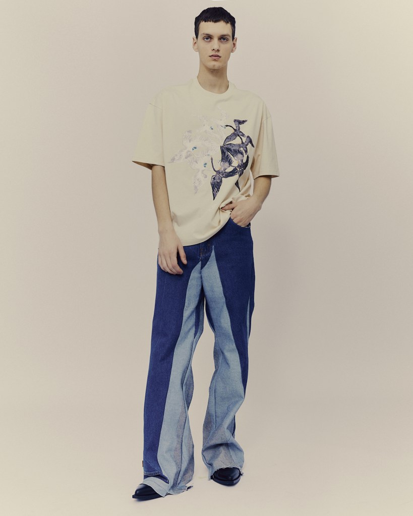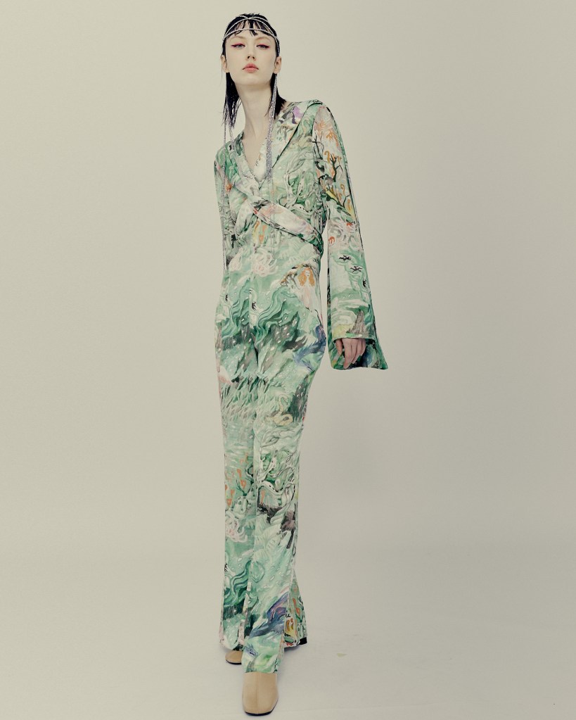 Potremmo parlare di un neoromanticismo punk in cui i personaggi di Florania si ispirano al lavoro del costumista Michiko Kitamura nel film “Ichi The Killer” (Takashi Miike, 2001): dalla sua interpretazione sfocata delle norme di genere nell’abbigliamento alla sperimentazione nei tessuti e nel design. Le stampe dipinte a mano con acquarelli evocano paesaggi grotteschi e naturali con figure misteriose come streghe e spiriti, conducendo ad una realtà alternativa, forse migliore della nostra quotidianità. Tra i capi proposti vediamo capotti e giacche sartoriali, completi in maglia con patchwork, polo e gonne midi, maglioni e accessori in cachemire riciclato con tinture sperimentali, sottovesti in collage creati da camicie da notte, kimoni vintage e denim aerografati. Nuovo inserimento sono gli articoli streetwear, come felpe con cappuccio e t-shirt, personalizzate da loghi e dipinti; tutti capi prodotti da SPAARKD, una divisione di Pangaia che ha confermato la collaborazione con il giovane marchio indipendente. Nuovi anche gli accessori, progettati in collaborazione con la designer di gioielli Margherita Potenza, che ha creato elementi metallici decostruiti, come chiusure per borse, cravatte punk e cinture.