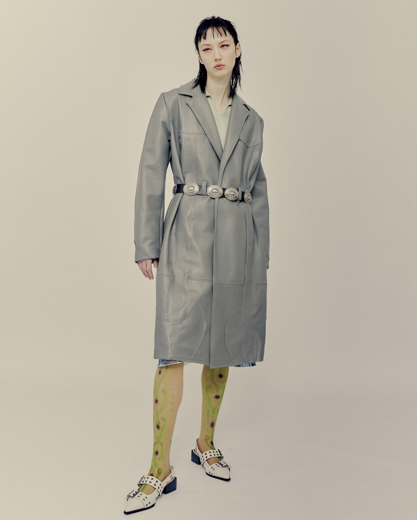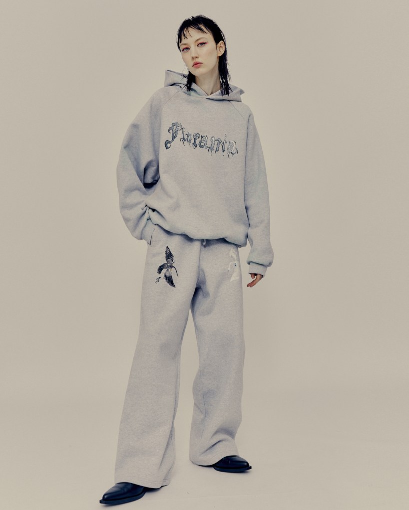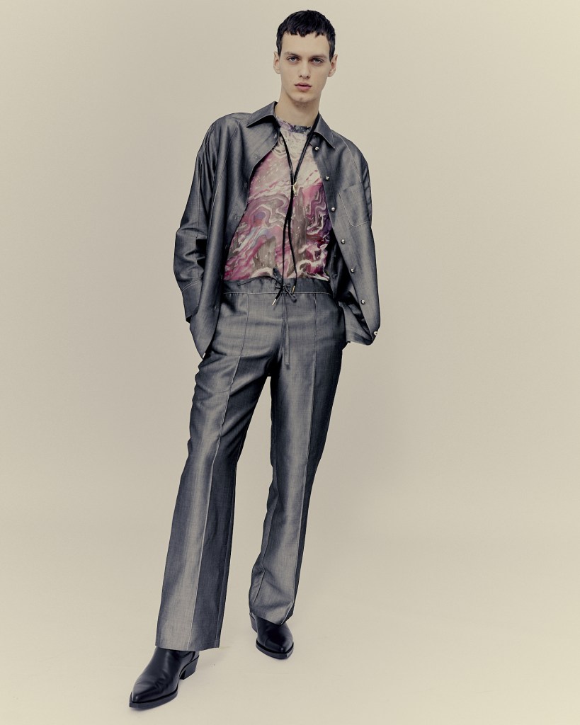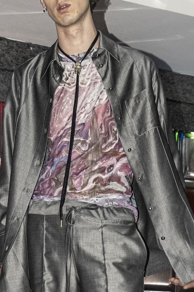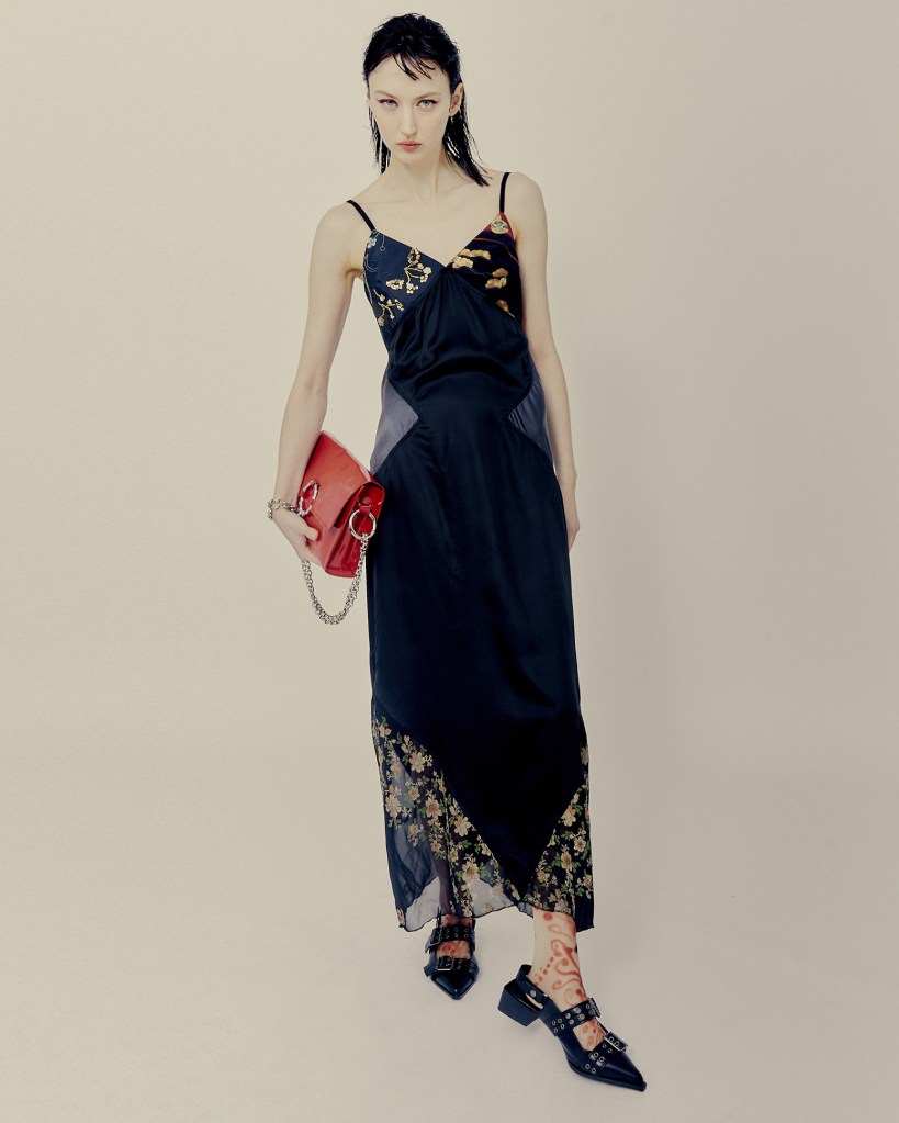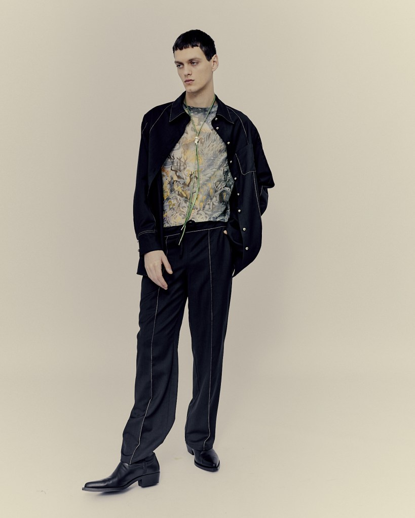 Potremmo parlare di un neoromanticismo punk in cui i personaggi di Florania si ispirano al lavoro del costumista Michiko Kitamura nel film “Ichi The Killer” (Takashi Miike, 2001): dalla sua interpretazione sfocata delle norme di genere nell’abbigliamento alla sperimentazione nei tessuti e nel design. Le stampe dipinte a mano con acquarelli evocano paesaggi grotteschi e naturali con figure misteriose come streghe e spiriti, conducendo ad una realtà alternativa, forse migliore della nostra quotidianità. Tra i capi proposti vediamo capotti e giacche sartoriali, completi in maglia con patchwork, polo e gonne midi, maglioni e accessori in cachemire riciclato con tinture sperimentali, sottovesti in collage creati da camicie da notte, kimoni vintage e denim aerografati. Nuovo inserimento sono gli articoli streetwear, come felpe con cappuccio e t-shirt, personalizzate da loghi e dipinti; tutti capi prodotti da SPAARKD, una divisione di Pangaia che ha confermato la collaborazione con il giovane marchio indipendente. Nuovi anche gli accessori, progettati in collaborazione con la designer di gioielli Margherita Potenza, che ha creato elementi metallici decostruiti, come chiusure per borse, cravatte punk e cinture.