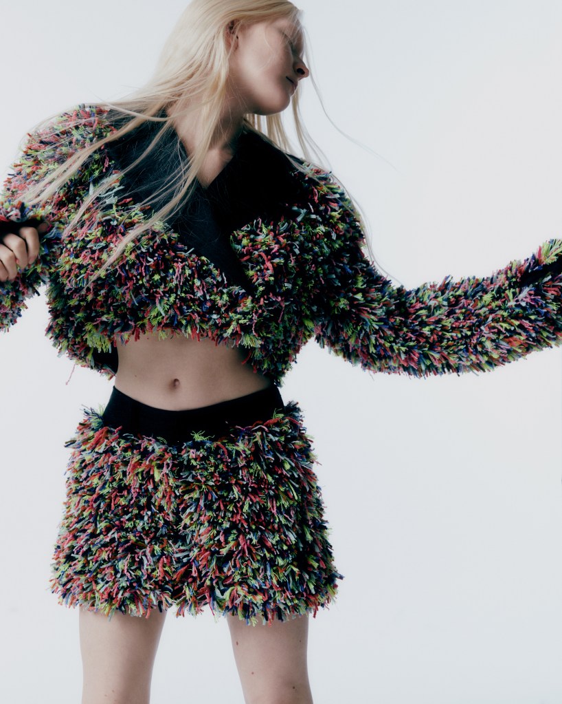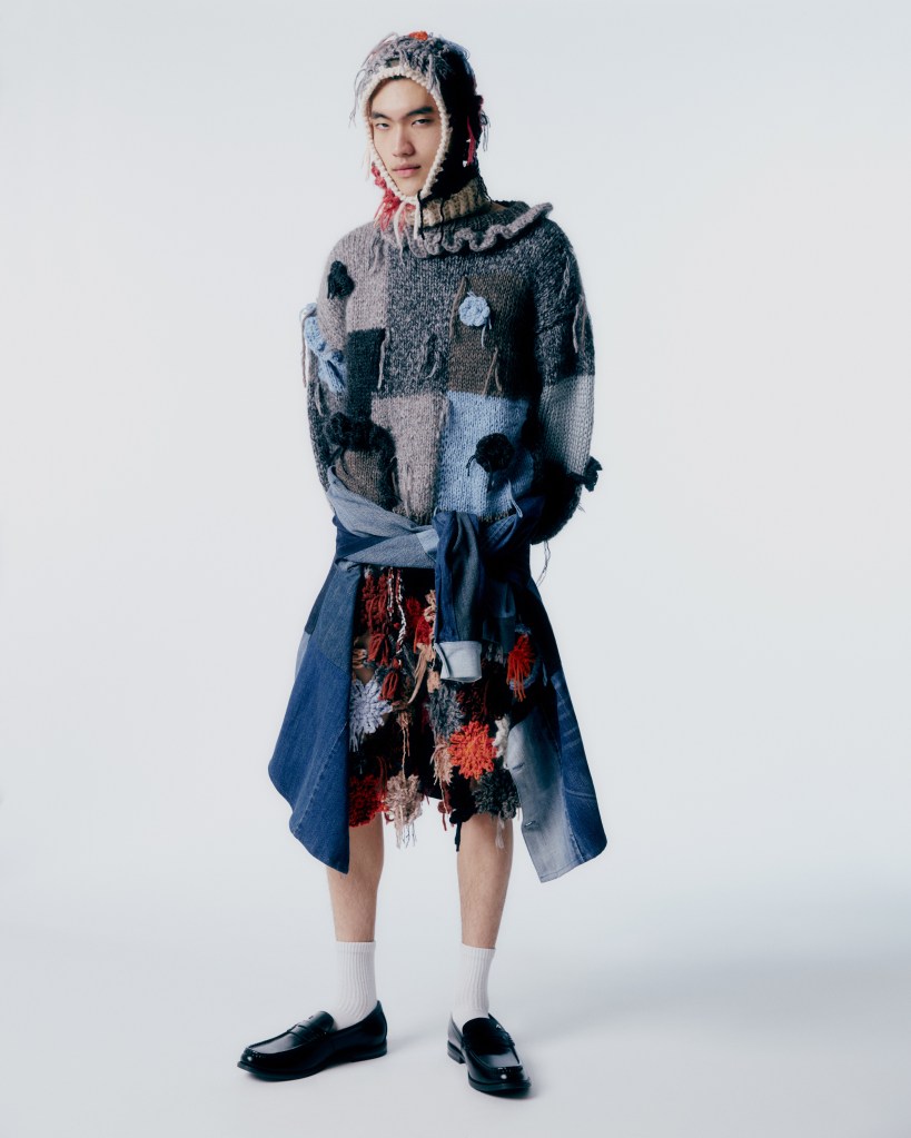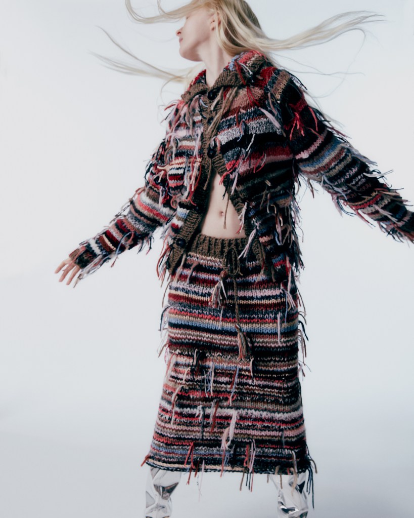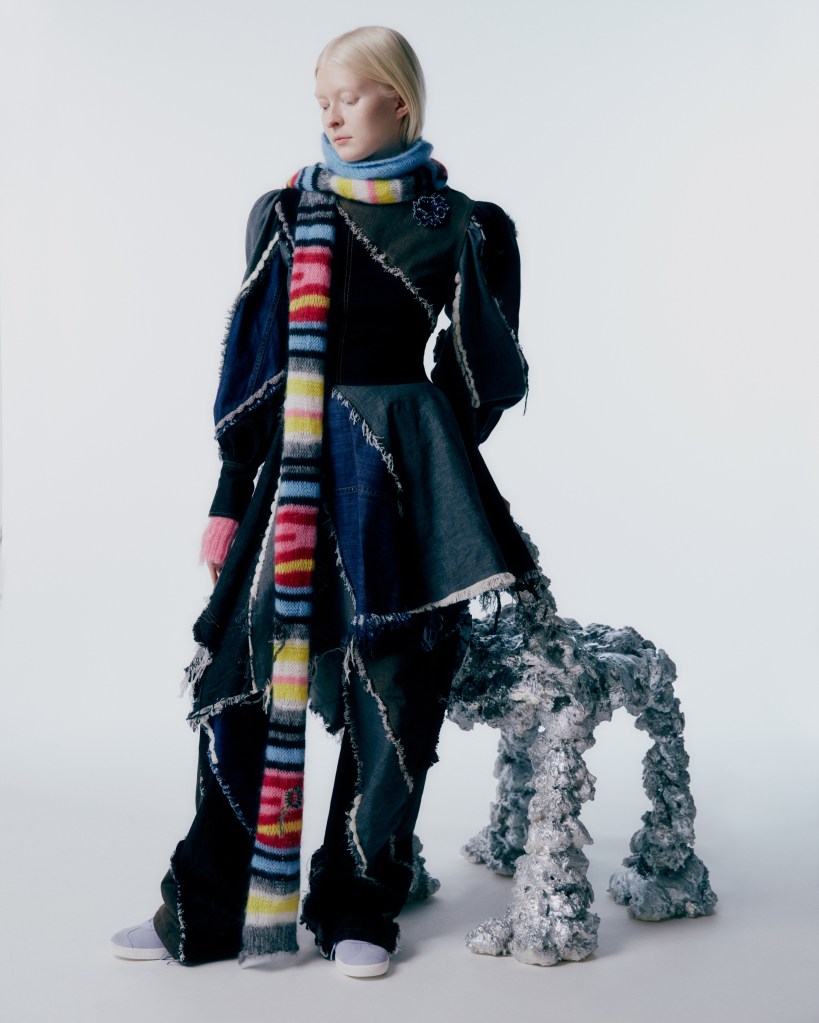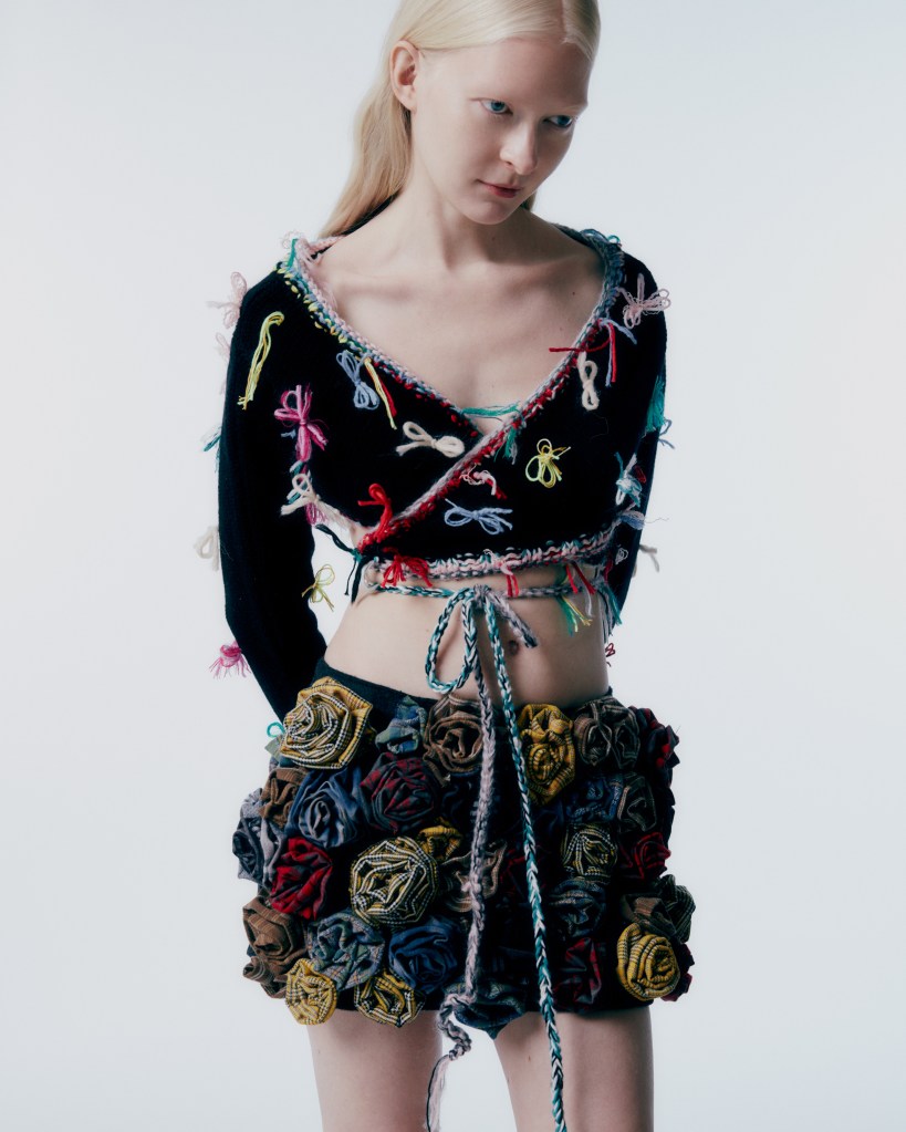 La collezione fonde artigianalità e innovazione. Da un lato troviamo un’ispirazione ancestrale, che parte dalla mitologia del Nord Europa e dalle storie tramandate oralmente da generazioni in generazioni; dall’altro una sperimentazione nell’utilizzo di materiali riciclati. Da sempre l’uso di tessuti preesistenti è un imprescindibile punto di partenza nel flusso creativo della designer per contribuire a ridurre l’impatto ambientale, rappresentando un’alternativa etica (e valida) alla moda convenzionale.