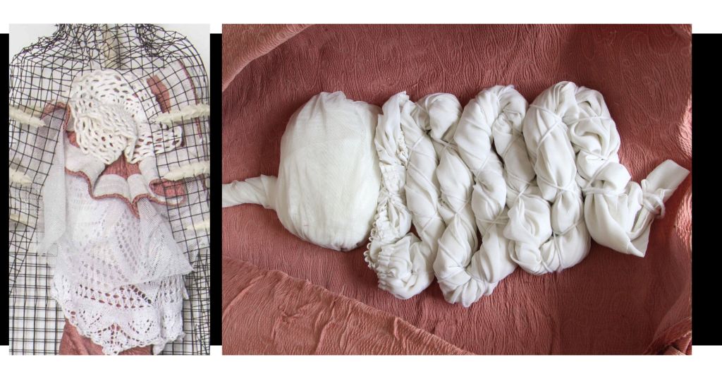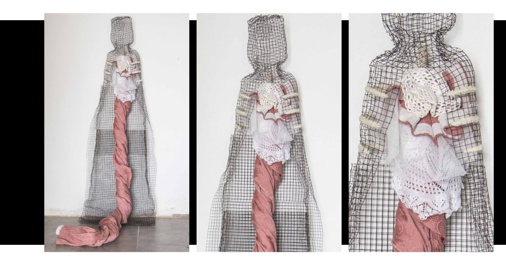 Intimate bodies, Gobbo Matteo, Scultura con materiali di recupero, Rete di ferro, colla, tessuti vari, materiale organico, 2023, Photo credit Gobbo Matteo.