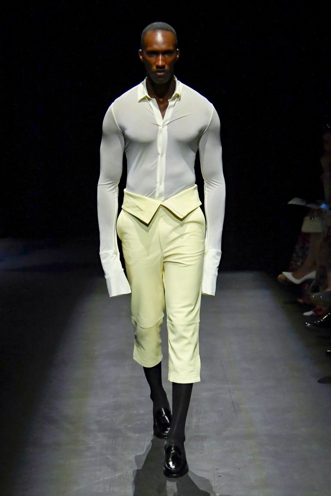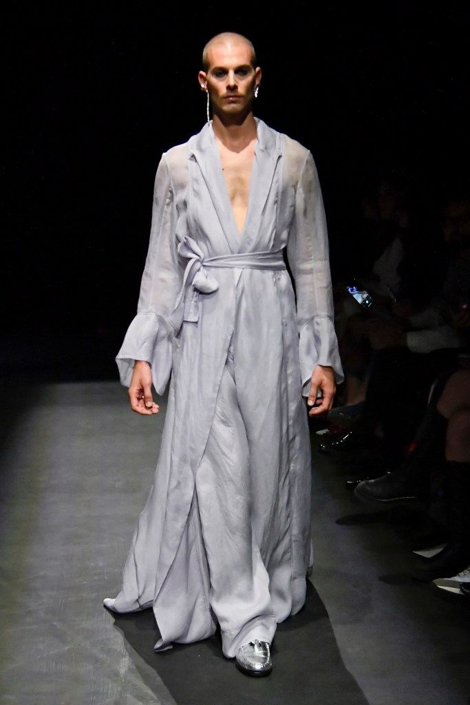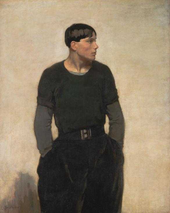 Il dualismo tra apparenza e realtà che emerge dalle opere di Philpot è stato abilmente trasmesso durante la presentazione della collezione: se parte dei look è stata esposta ordinariamente a manichino, un’altra porzione era indossata da modelli che si aggiravano per la stanza con movimenti lenti ed eleganti. Osservando alcuni dei lavori più famosi del pittore londinese si scorge immediatamente l’ispirazione per le silhouette. La giacca in Portrait of Lady Benthall viene ricreata e abbellita con delle margherite (come Daisy era il nome della sorella di Glyn) in argento riciclato create, come tutti gli altri gioielli presenti, da ANUKA, brand londinese di gioielleria. La polo in Man in White diventa una camicia attillatissima con maniche esageratamente lunghe, così come è chiaro l’omaggio al quadro A Young Breton, forse una delle opere più celebri di Philpot.