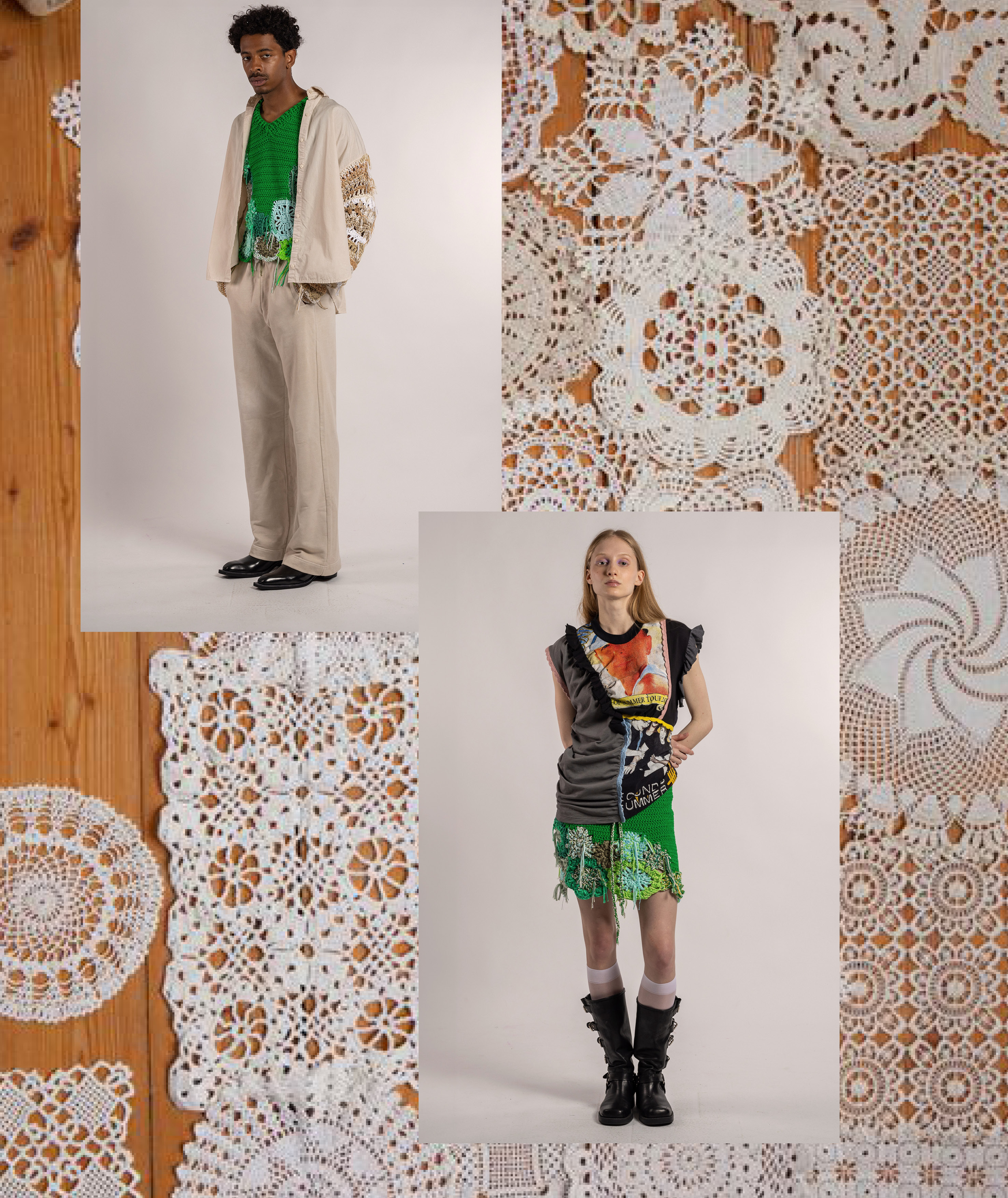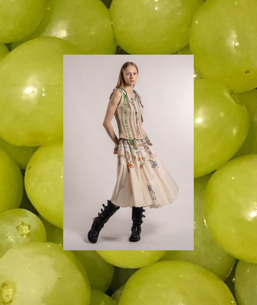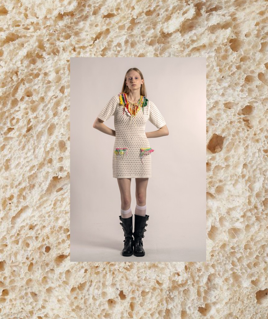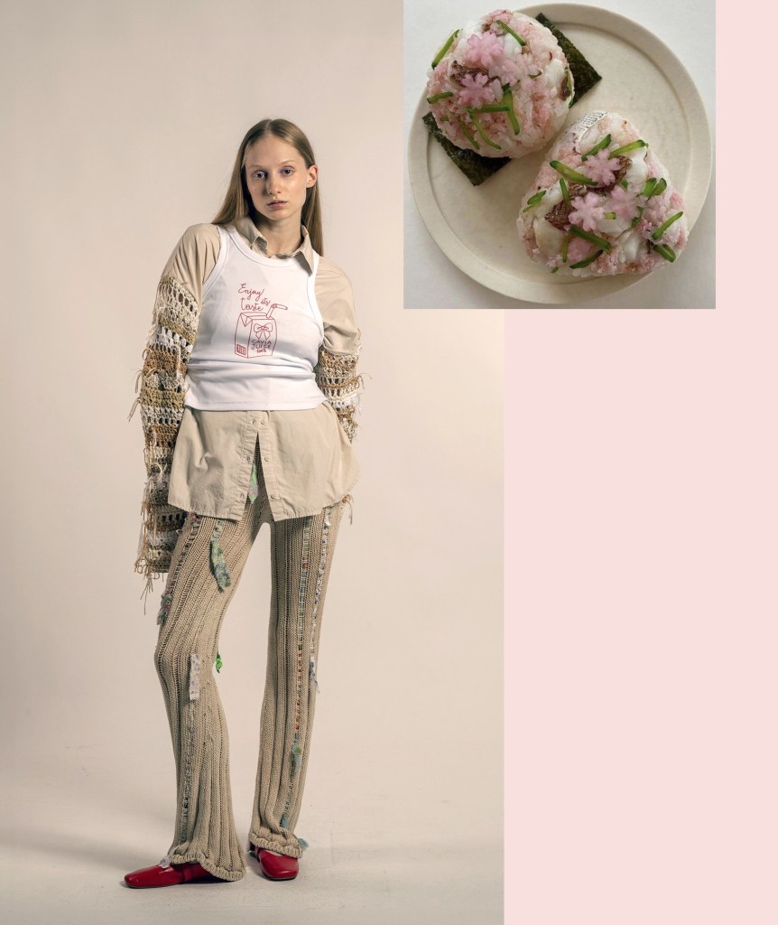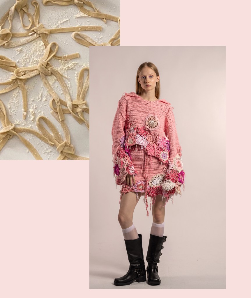 Ci troviamo precisamente in via Pasquale Sottocorno 36, a Milano, presso la Rosticceria Giacomo: non un ristorante qualunque, ma un vero e proprio salotto culinario. È domenica, una domenica di settembre che profuma ancora di agosto, in un luogo che rimembra la stessa tenerezza di mio nonno che aiuta ad apparecchiare la tavola, che taglia il pane per la famiglia, che guarda mia nonna, la quale sfuma il ragù. Più ci addentriamo in questo chiostro quasi magico e incantato, più sentiamo odori italiani e voci internazionali. Qui notiamo subito delle figure che tra nastri floreali intrecciati, capi a maglia larga, denim impreziositi da fasce all’uncinetto e patchwork di tessuti inaspettati, si muovono attorno al patio, parlano e scherzano tra di loro.