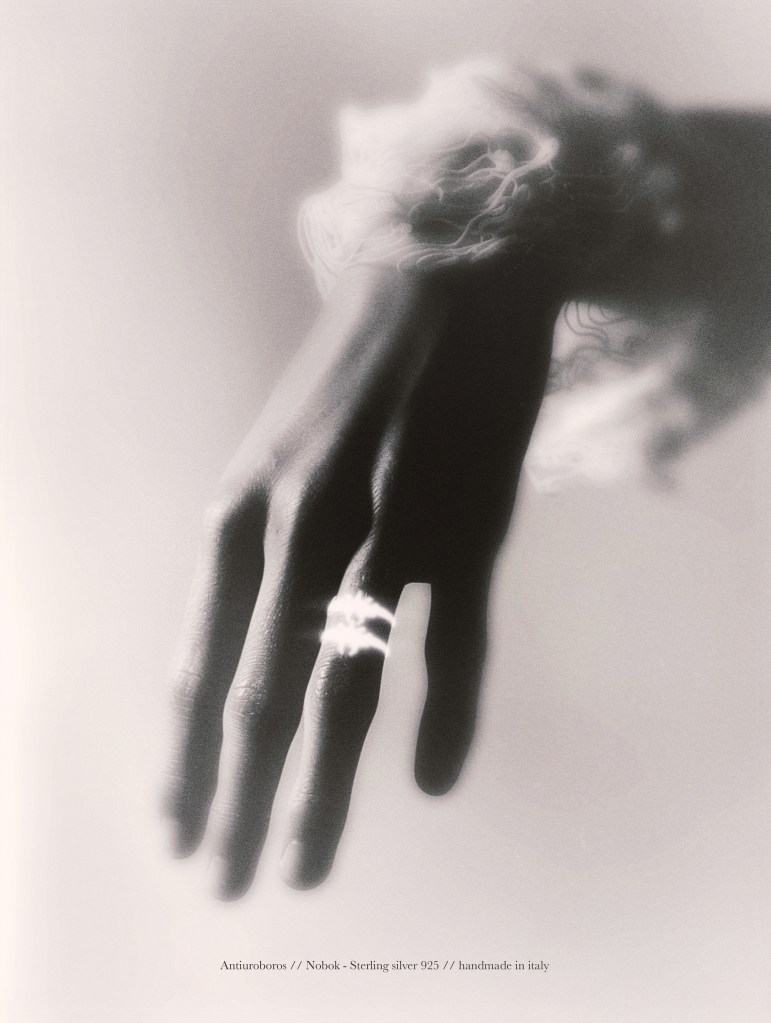 G.: All’inizio erano solo tre anelli, poi abbiamo sviluppato insieme il concept che ruotava attorno all’idea di circolarità e ai quattro elementi (cinque con etere). Per questo motivo la collezione si chiama “uroboros”. Ci sembrava perfetto creare qualcosa per tutte e cinque le dita della mano.