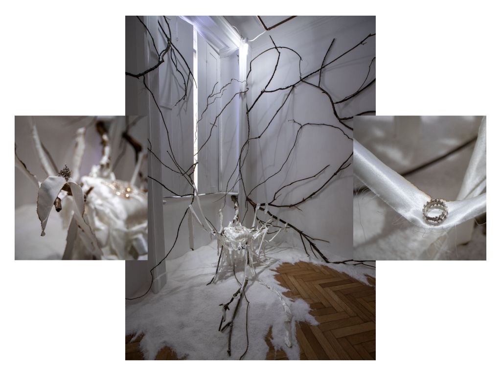 G.: In un certo senso sì, è come se ci fosse una connessione. Lì, infatti, è avvenuta la prima performance con la scenografia di Katia, che lavora spesso sull’esoterismo, e abbiamo allestito questi rami all’interno della stanza dove c’erano anche gli anelli inseriti come ritrovamenti fossili.