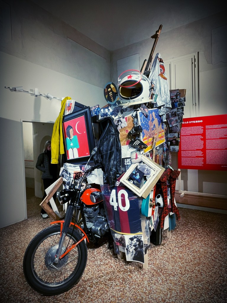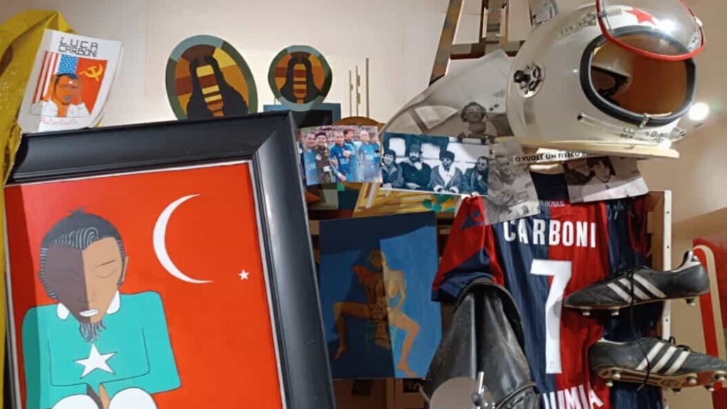 Entrare in questa mostra sembra quasi di varcare la soglia di casa dell’artista, un luogo intimo in cui Carboni si racconta oltre la musica, attraverso un linguaggio visivo che svela aspetti inediti della sua persona. Accolti da una motocicletta, spesso citata nelle sue canzoni, lo spettatore è invitato a esplorare oggetti simbolici che raccontano la vita privata e le passioni dell’artista: la maglia autografata della squadra del cuore, il Bologna, le scarpette, il pallone, le sciarpe da stadio, e fotografie che colgono istanti di vita e ricordi speciali. L’immancabile giubbotto in pelle, emblema di una gioventù che ha segnato un’intera generazione, e la chitarra, compagna delle sue canzoni più amate, sono solo alcuni degli elementi che raccontano la sua storia.