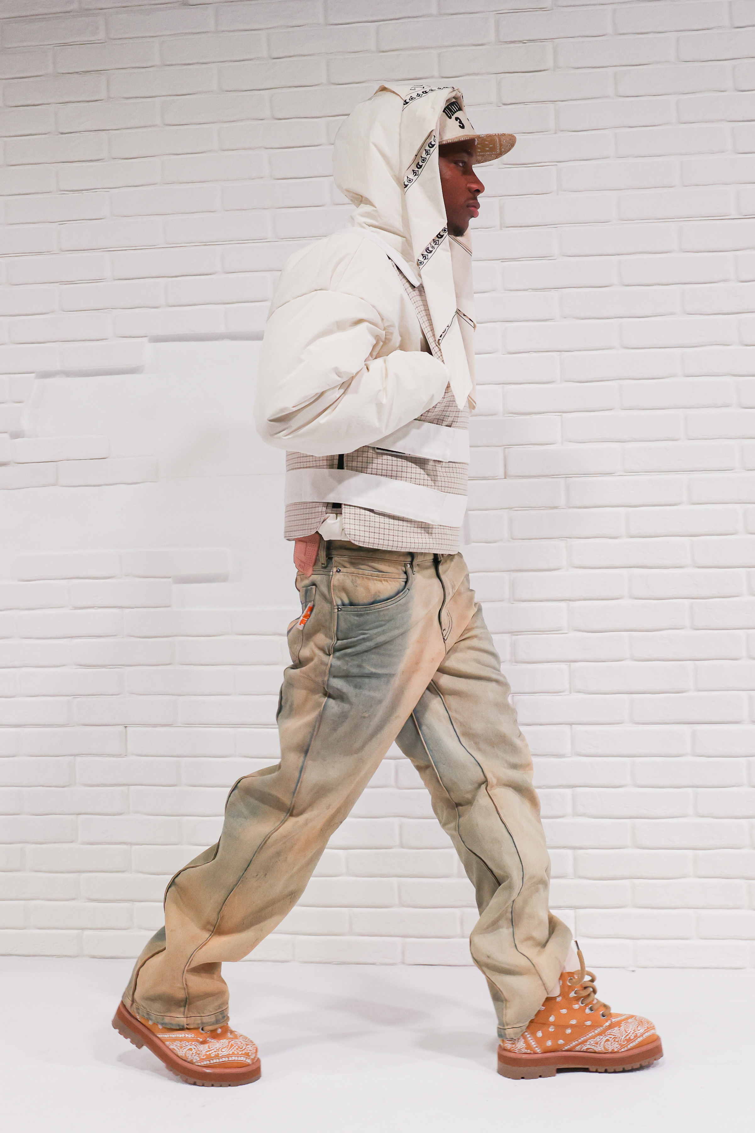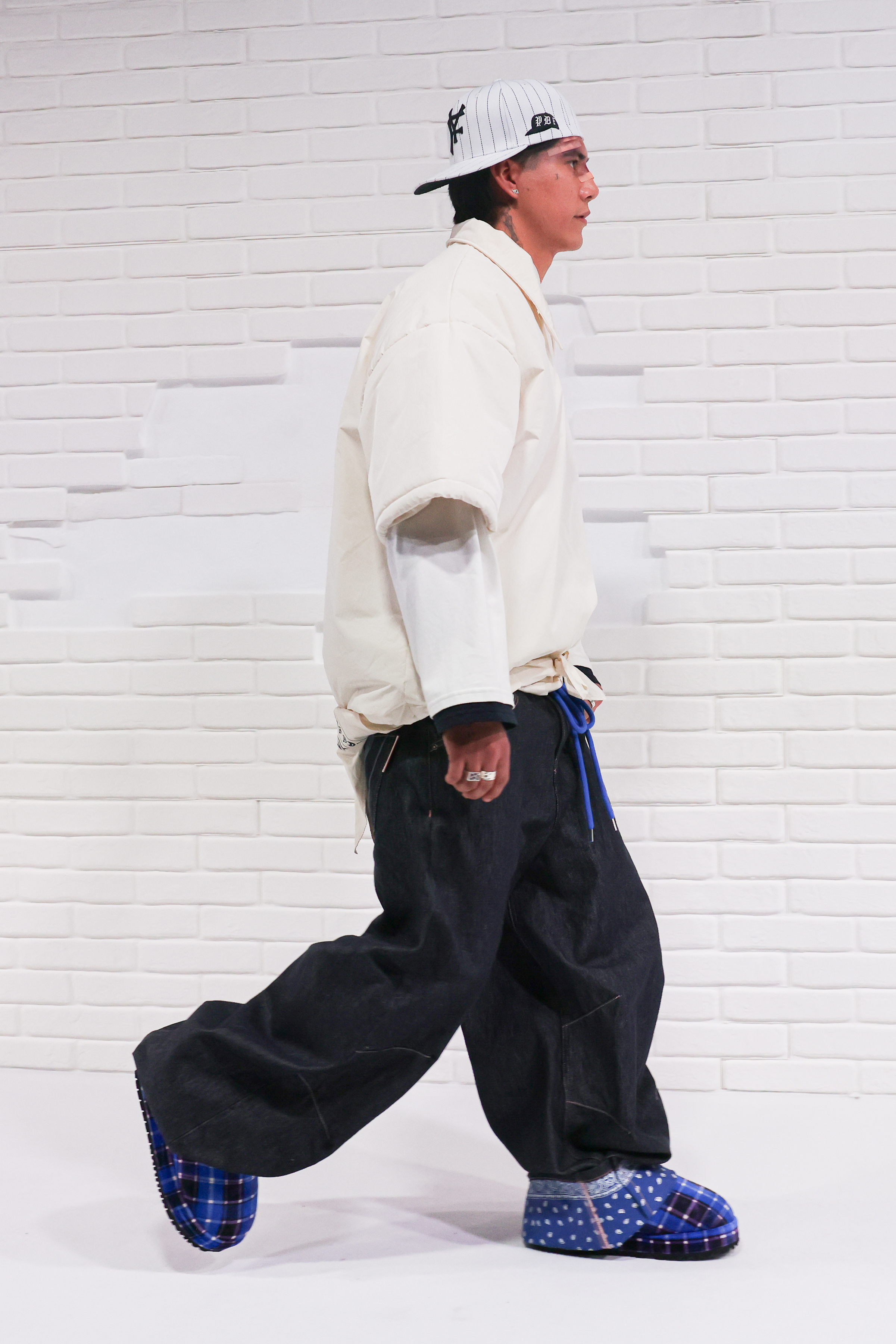 Gli accenti sportivi all’aria aperta si intrecciano con la forza dell’estetica urbana. Le proporzioni audaci e le silhouette stratificate si ispirano al design pratico e innovativo dell’attrezzatura da snowboard, mescolando l’avanguardia tecnica con l’energia cruda dello streetwear. Blazer con revers decostruiti, tute utilitarie in tessuti cangianti e capispalla trapuntati esprimono un perfetto equilibrio tra funzionalità e gioco stilistico.