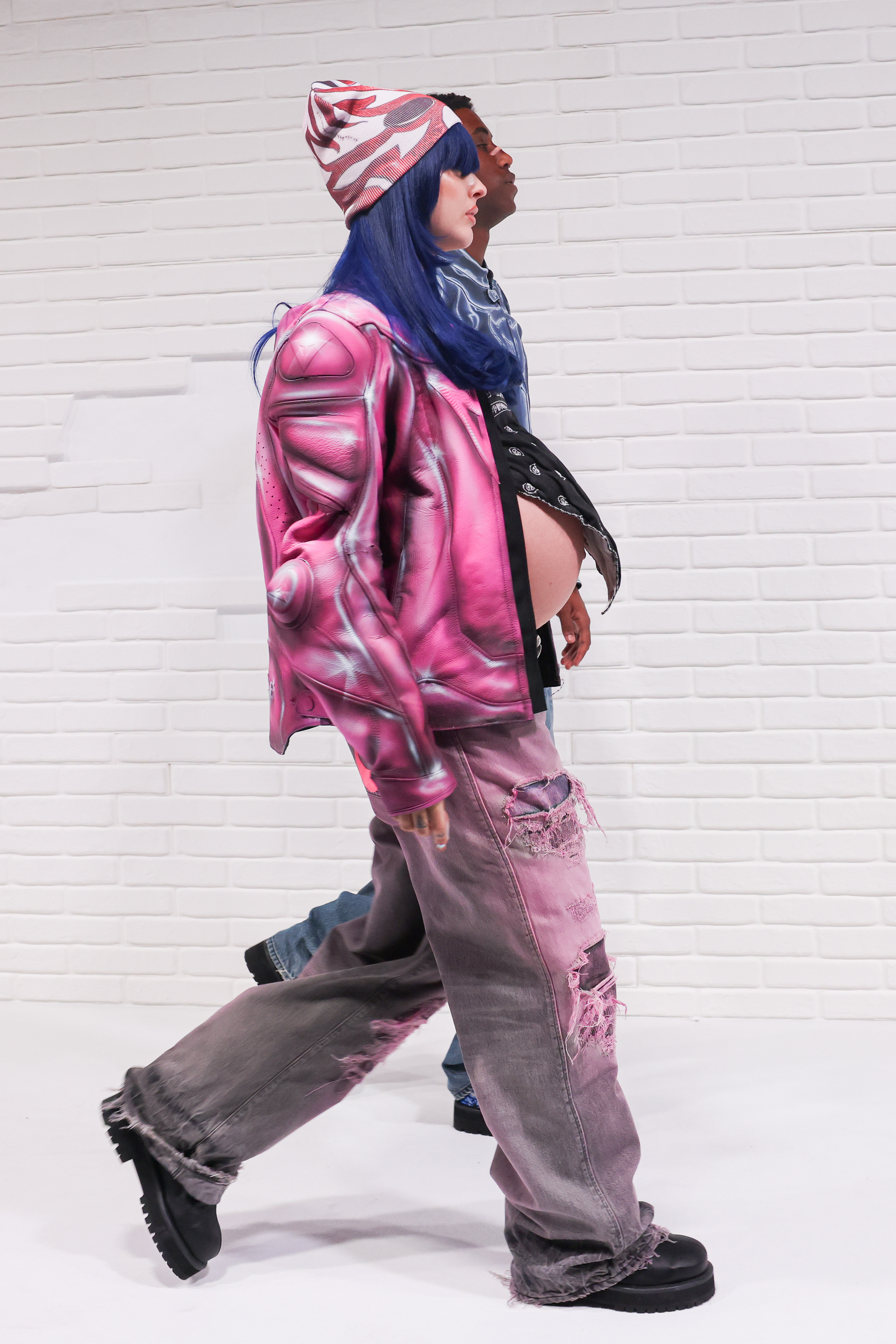 Nella nuova collezione di Domenico Formichetti emerge un amore profondo per i dettagli e gli accessori, elementi che da sempre contraddistinguono il suo design. Oggi, questi si arricchiscono di un nuovo linguaggio espressivo grazie all’uso innovativo dell’aerografo. Un aspetto fondamentale è stato anche il coinvolgimento di talenti emergenti come Leonardo Canton e Carlo Scardigno, che hanno contribuito a dare un ulteriore slancio creativo alla collezione.
