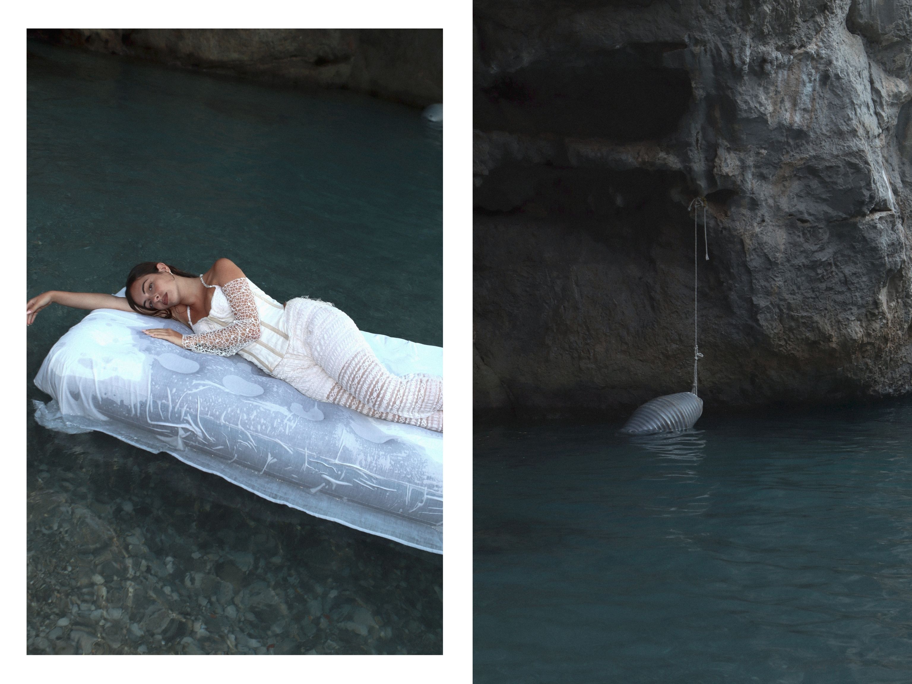 In un’epoca in cui il mare rappresenta destino e via di fuga per molti, gli scatti uniscono mitologia e realtà, esplorando il potere primordiale dell’acqua, fonte di vita. I simboli mitologici, come Afrodite che nasce dalla spuma del mare, celebrano l’origine e la fertilità, con l’acqua come culla dell’esistenza. Un viaggio tra cultura e moda, dove tessuti leggeri e fluidi evocano il mare, le onde e gli abissi, raccontando la connessione tra il mondo reale e il mito eterno delle acque.