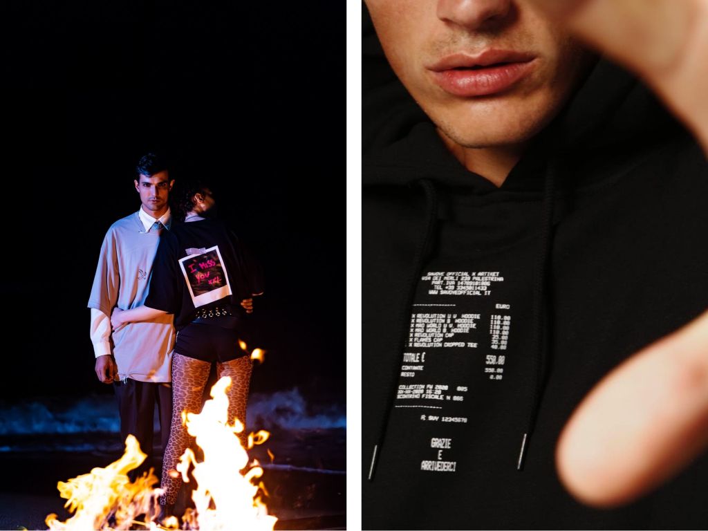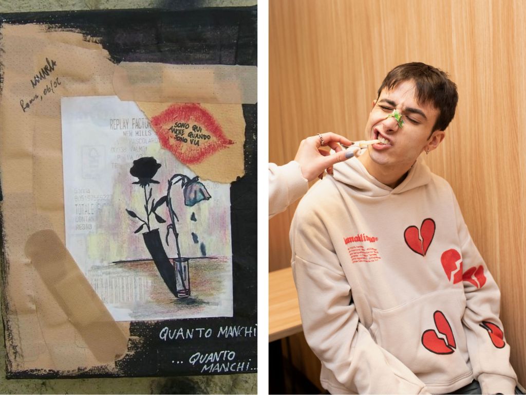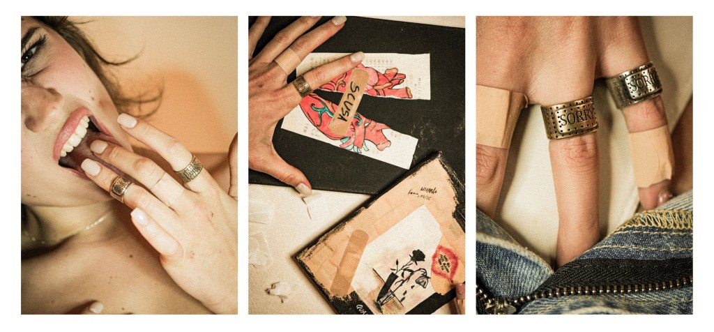 Ultima news è stata la collaborazione con Andrea, fondatore del brand di gioielli Indigeno. Come è nata? L’idea degli anelli c’è sempre stata, serviva solo l’occasione. Dicevo già ai miei amici che avrei voluto realizzarne uno, un po’ per poterli indossare più che vendere. Poi quando Andrea me l’ha proposto, ho pensato di unire le due cose: sia fare un anello che avrei indossato, sia un oggetto commerciale. Per la realizzazione ci siamo ispirati a un mio quadro dove è presente un cerotto vero con su scritto “scusa” con il pennarello nero che tiene insieme un cuore strappato a metà. Per quanto riguarda, invece, la realizzazione pratica, quella è stata tutto merito di Andrea. Siamo molto soddisfatti del prodotto finito perché è anche il simbolo di un’amicizia e di una stima artistica che ci ha portato poi alla collaborazione.