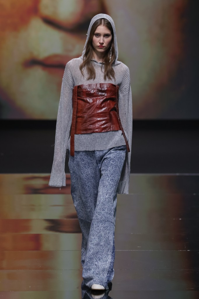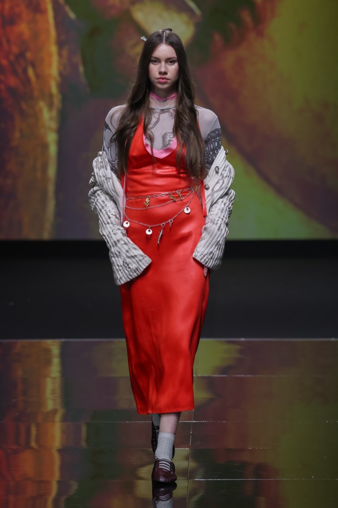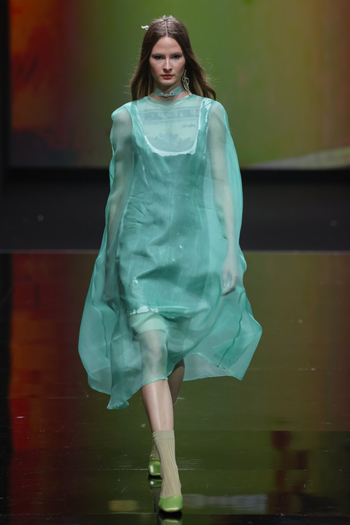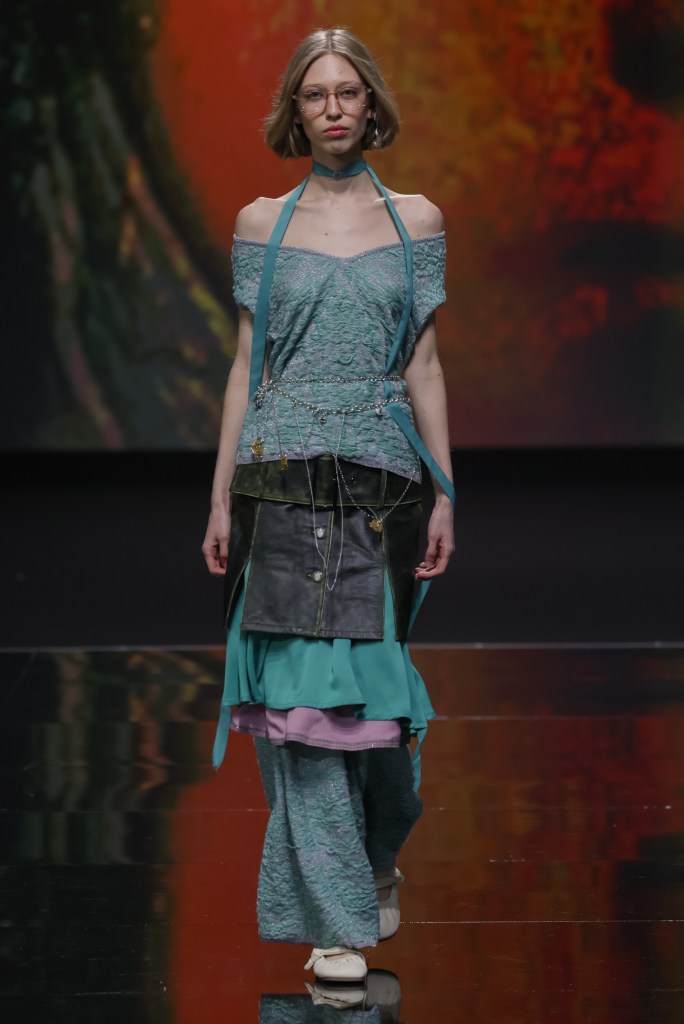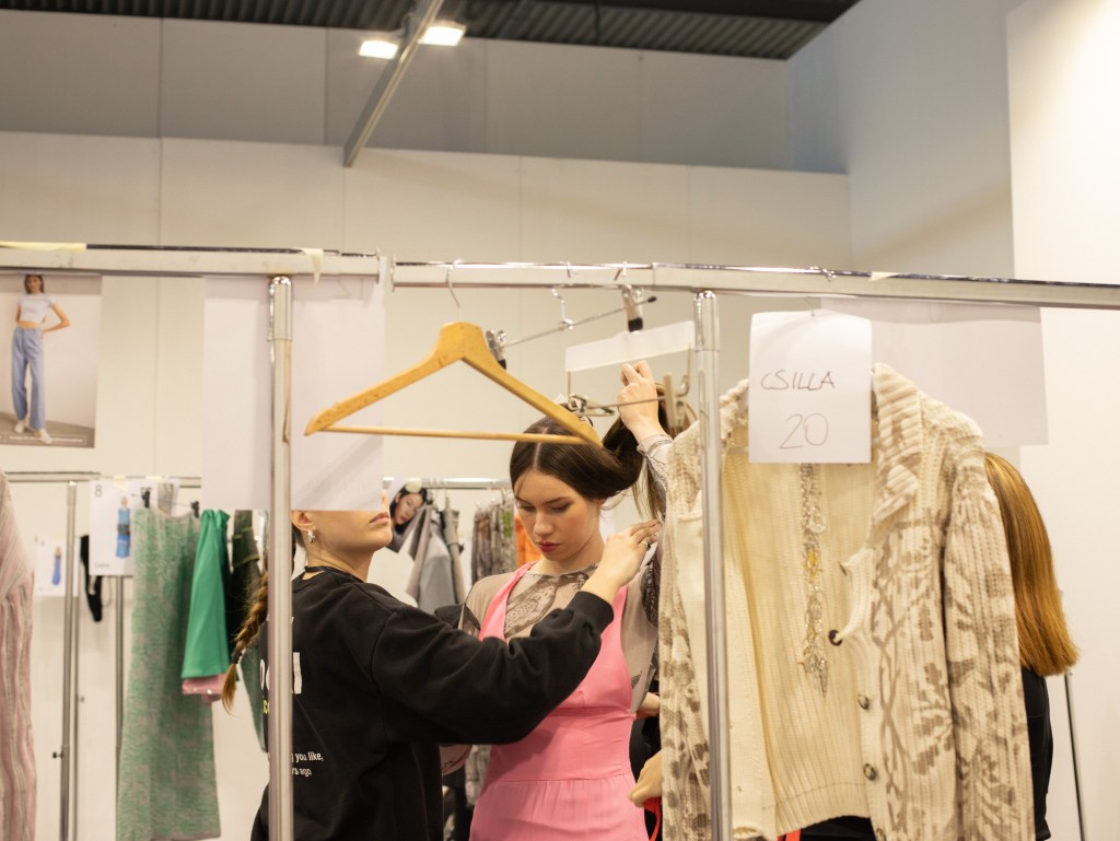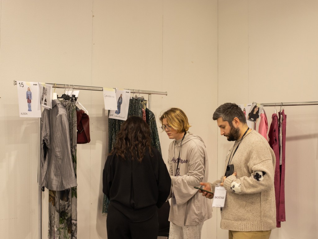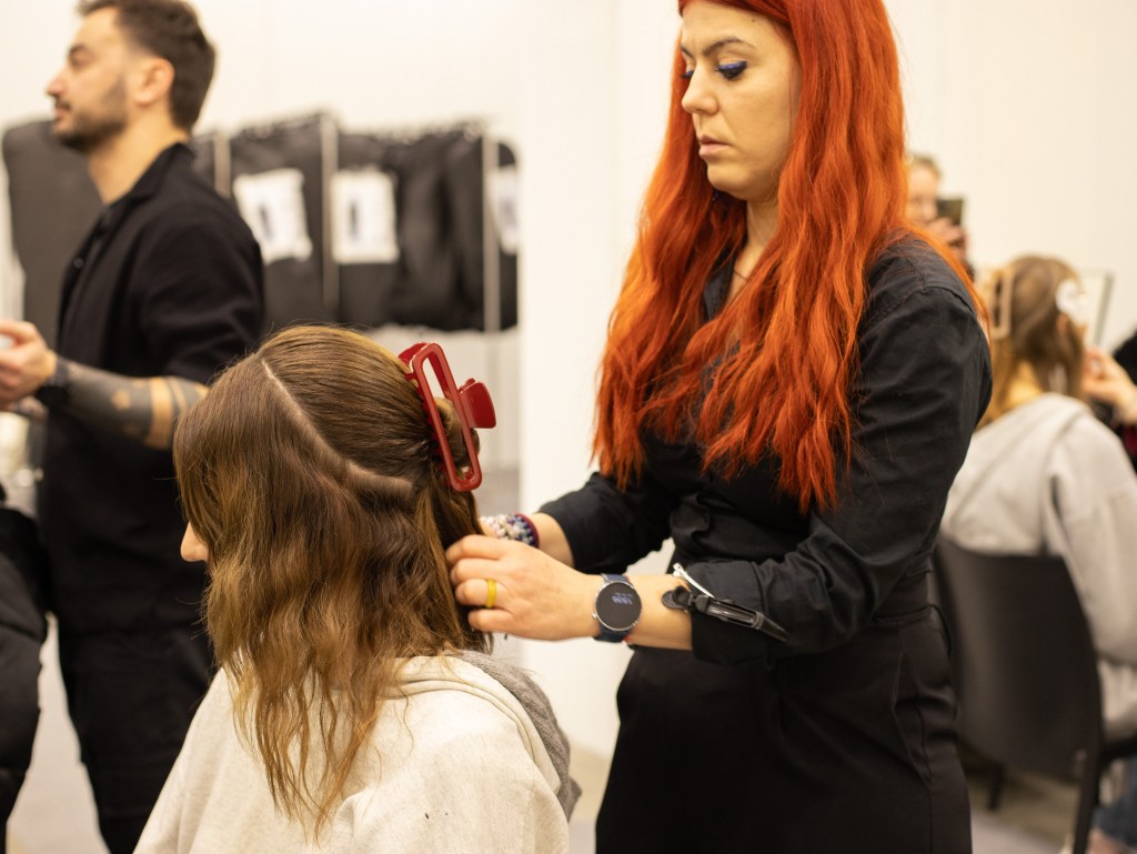 Entriamo in uno spazio immenso, bianco e pieno di abiti. Da un lato, troviamo la zona dedicata al make-up e all‘hair styling, con i modelli in fase di preparazione; dall’altro, la designer è impegnatissima a provare ogni look su ciascuna modella, senza mai perdere di vista nessuna di loro. Perché, sotto il suo vigile e creativo occhio, ogni dettaglio è fondamentale. Così, nonostante qualche minuto di ritardo, ci ritroviamo con tutte le modelle pronte in fila, curate nel minimo dettaglio: dai capelli agli accessori, passando per lo styling, che gioca sulle sovrapposizioni, fino ai gioielli di STUDIO UMIDO.