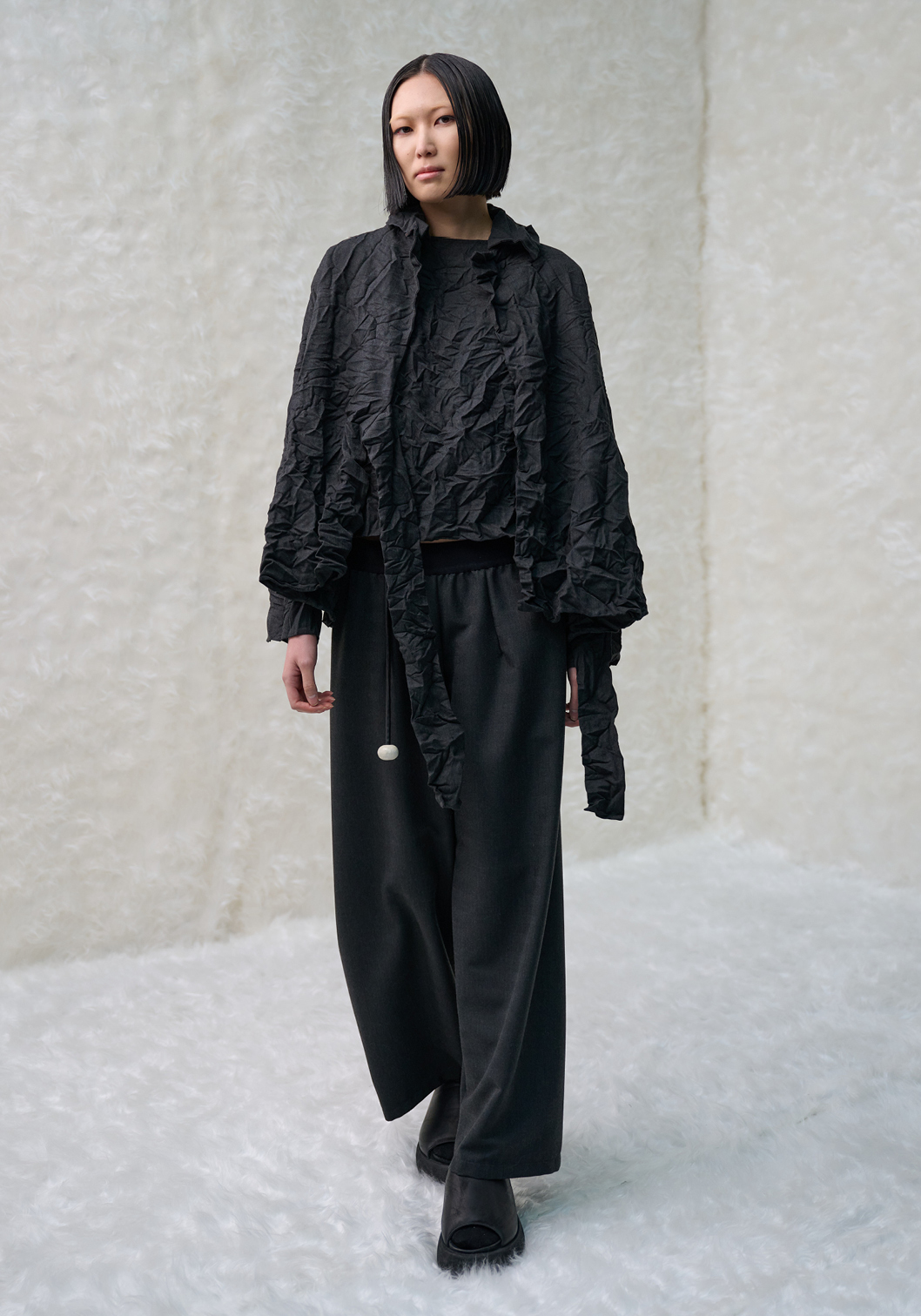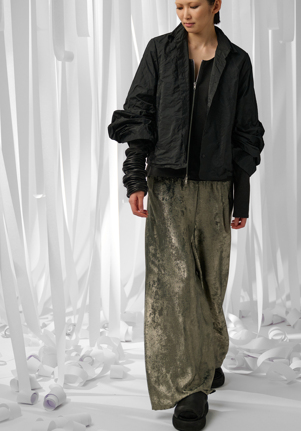 In particolare, Fiato d’artista ben descrive la nuova collezione presentata a cui più di ogni altra opera di Manzoni l’autrice si ispira. Frammenti di palloncini scoppiati, cuciti su un collo di sciarpa in feltro, e l’innovazione dei tessuti come l’Achromatic Waves, una trama trapuntata che crea struttura e volume su gonne e maglie, sono solo alcuni degli elementi distintivi di #U_Tech2. A questi si aggiungono tessuti tecnici ed ecopelle, sapientemente stropicciati, e trench double-face arricchiti da imbottiture leggere, che danno loro l’aspetto etereo di nuvole. La palette di colori, che spazia dal nero all’antracite, dal verde militare all’oro metallico, riflette il rigore razionalista e la continua ricerca che caratterizzano tanto l’arte di Manzoni quanto la moda della Calderara.