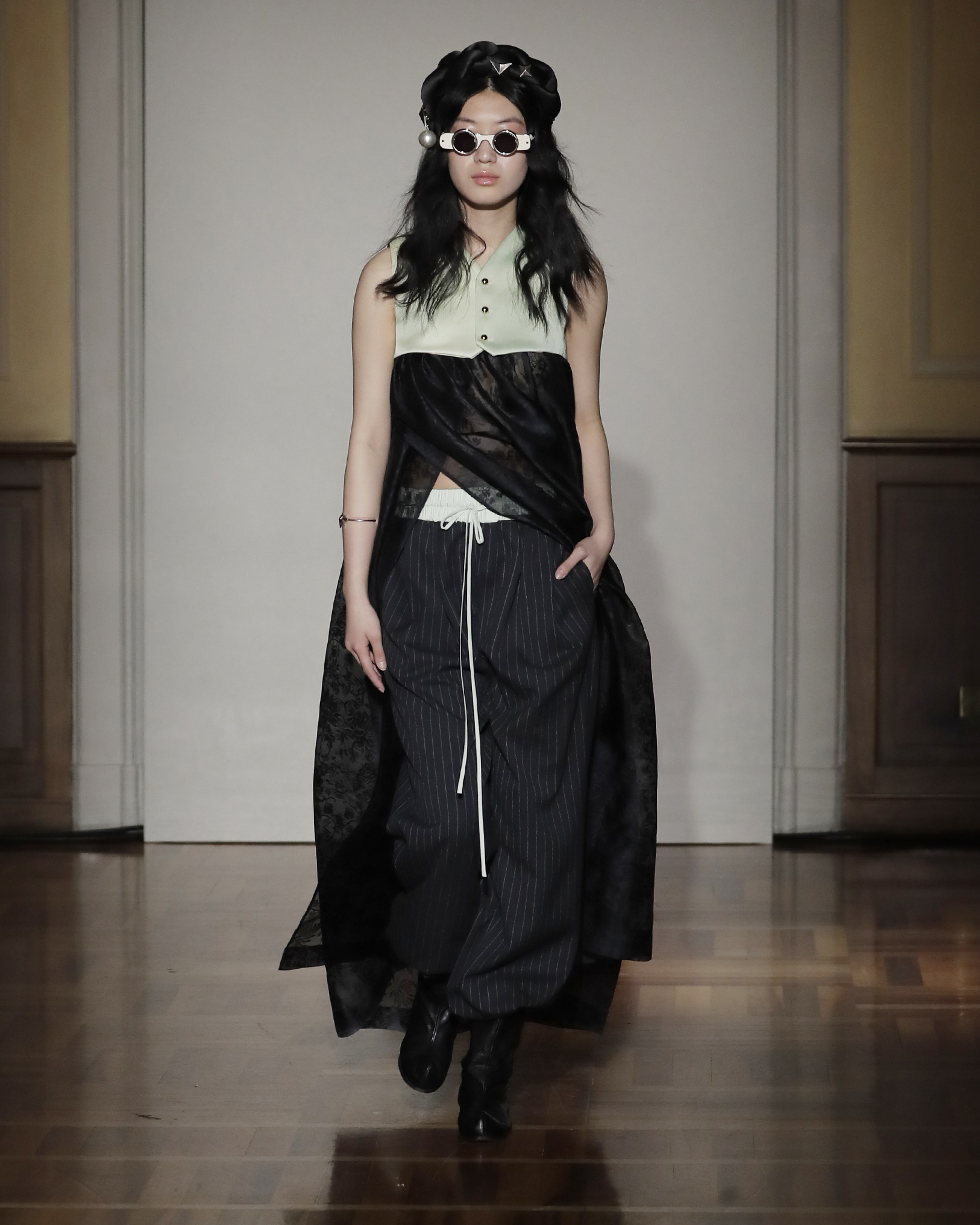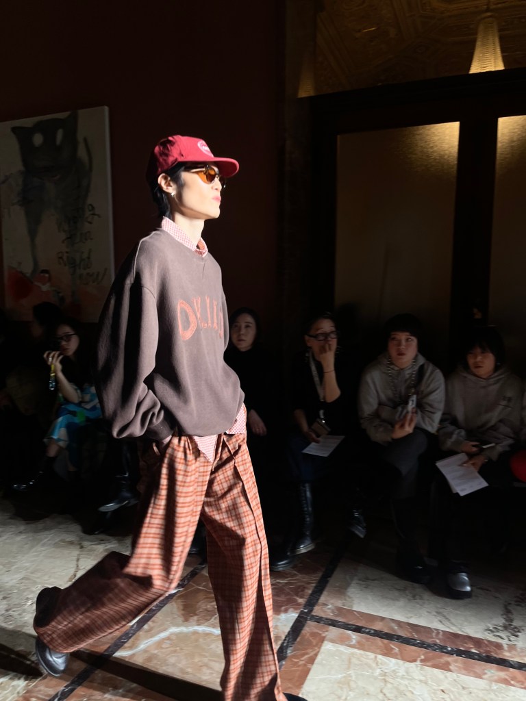 Un altro brand che ci ha letteralmente incantato è Riu&Viu, fondato nel 2019 da Yeji Kim, designer e appassionato ricercatore di costumi tradizionali coreani. Ciò che rende unico questo marchio è la sua straordinaria capacità di guardare al passato con occhi contemporanei. Il nome stesso racchiude questa filosofia: “RIU” significa “flusso” mentre “VIU” rappresenta la “vista” – come a suggerire che attraverso lo sguardo del presente possiamo reinterpretare ciò che è passato prima di noi. Passeggiando tra i loro capi in esposizione, abbiamo avvertito un dolce senso di nostalgia mai stantio, ma piuttosto rinfrescante e attuale. Una danza equilibrata tra memoria e innovazione che Yeji Kim ha saputo orchestrare con maestria rara.