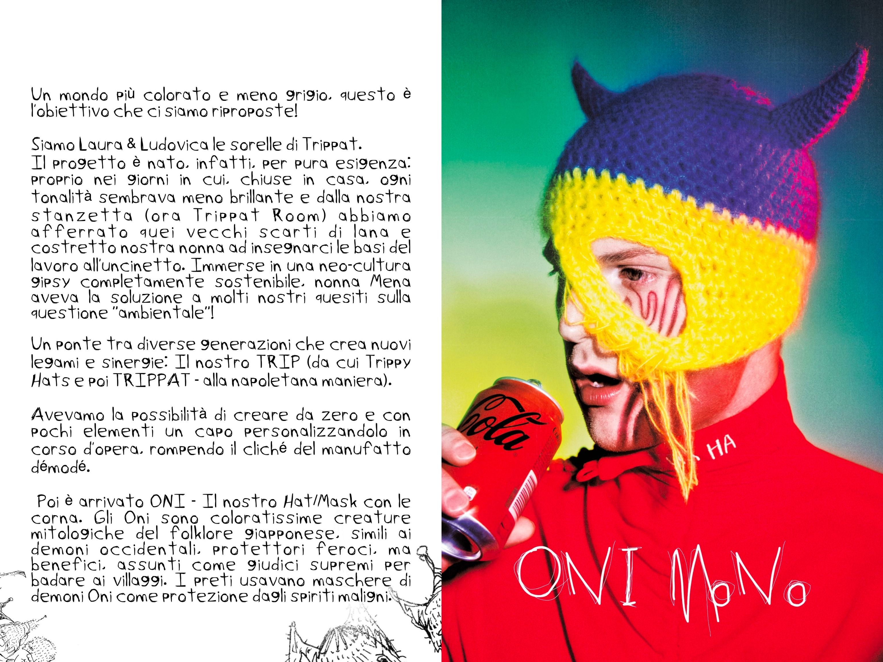 Il prossimo tema di ALL-in sarà l’estetica del brutto, quella bruttezza come terreno fertile per la sperimentazione e l’espressione artistica. Leggendo che il vostro modello del cuore è l’ONI, ispirato a un demone giapponese associato a persone emarginate, ribelli, artisti itineranti, e che all’apparenza è una figura non tradizionalmente bella, mi sembra di ritrovare questo concetto anche in Trippat. Mi incuriosisce sapere: a chi volete parlare con le vostre creazioni? O meglio, a chi volete dare una voce? Le nostre creazioni parlano a chiunque si senta libero di essere autentico, diverso, ribelle, ma soprattutto a chi cerca una voce fuori dagli schemi tradizionali. Vogliamo dare visibilità e coraggio a chi spesso viene ignorato o marginalizzato, dimostrando che la bellezza può avere tante forme, anche quelle apparentemente “brutte” o insolite.