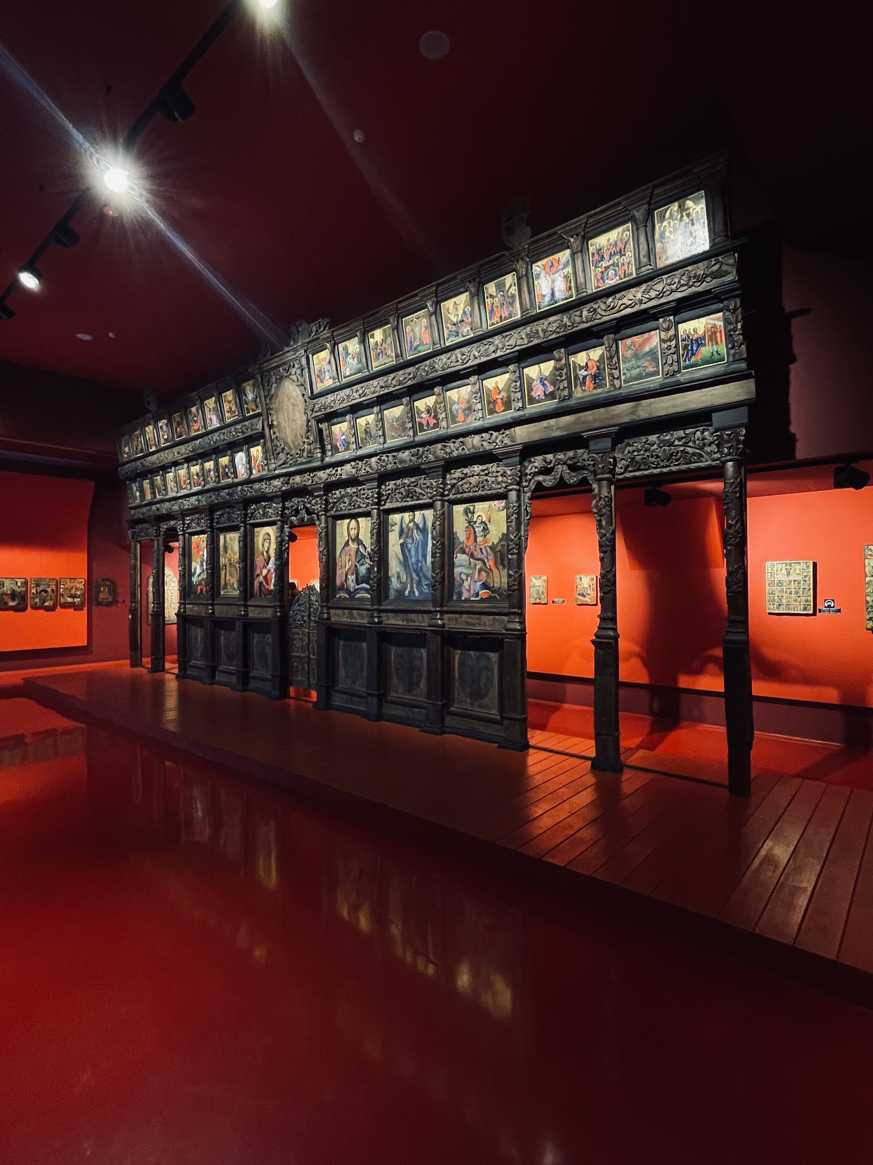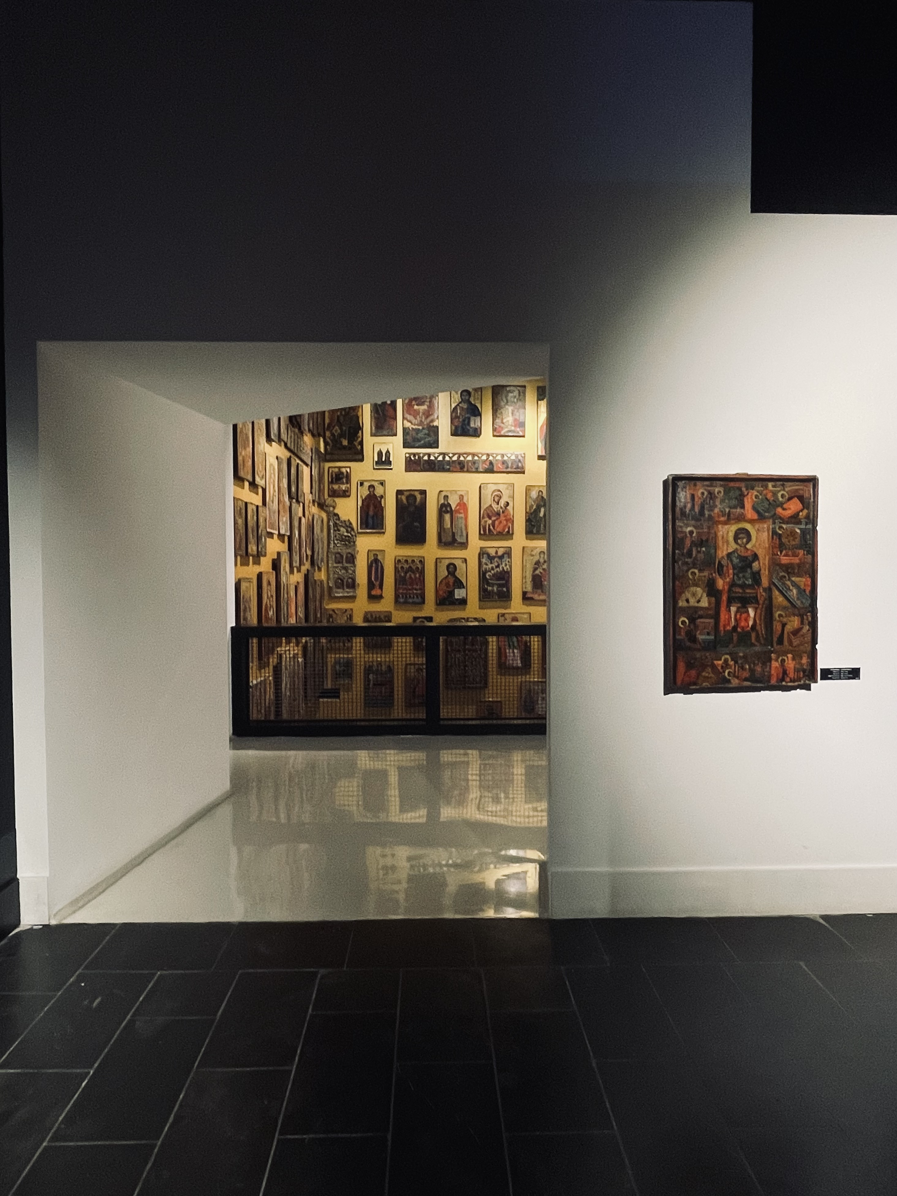 Questo museo è molto più di un luogo di conservazione: è una soglia tra due tempi, una sintesi riuscita tra memoria e presente. La modernità architettonica non si impone, ma si mette al servizio del messaggio spirituale e artistico delle icone, rendendo l’esperienza del visitatore al tempo stesso estetica e interiore. La luce naturale è protagonista nella narrazione architettonica e diventa essa stessa un elemento sacro, entrando con delicatezza e rievocando la penombra spirituale delle antiche chiese. In questo modo, essa non solo illumina le icone, ma ne accompagna la spiritualità, creando un contesto contemplativo che invita alla riflessione e al raccoglimento. Il contrasto tra la ricchezza simbolica e cromatica delle icone (oro, rosso, blu intensi) e l’ambiente museale essenziale e luminoso crea un effetto potente: l’arte medievale, pur antica, appare attuale, viva, inserita in un contesto che la rende accessibile e rilevante anche per l’osservatore moderno. Alcuni dettagli architettonici – come l’uso del legno in alcune zone, le volte accennate o la disposizione delle nicchie – richiamano elementi ecclesiastici, senza però imitare direttamente lo stile bizantino. Parliamo di una reinterpretazione moderna dell’ambiente sacro che riesce a onorare il passato senza rinunciare al linguaggio architettonico contemporaneo, creando un ponte emotivo e intellettuale tra visitatore e opera d’arte.
