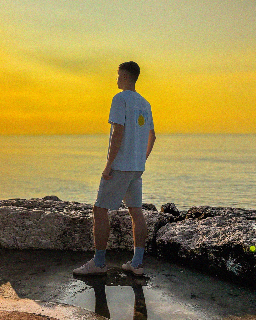 La loro visione prende forma tra i banchi del liceo artistico, dove teoria e manualità si fondono in linguaggio e identità. La loro ultima capsule in uscita oggi, “Dolce Far Niente”, è più di un titolo evocativo: è un manifesto. Il drop prevede capi che richiamano le sensazioni della classica estate italiana, quell’ozio creativo, quella contemplazione, quella libertà delle piazze assolate del Sud dove il tempo sembra fermarsi. Questa visione ci rimanda moltissimo alle vacanze in riviera, alle cartoline retrò, agli scatti in pellicola anni ’90 e all’amato cinema felliniano.