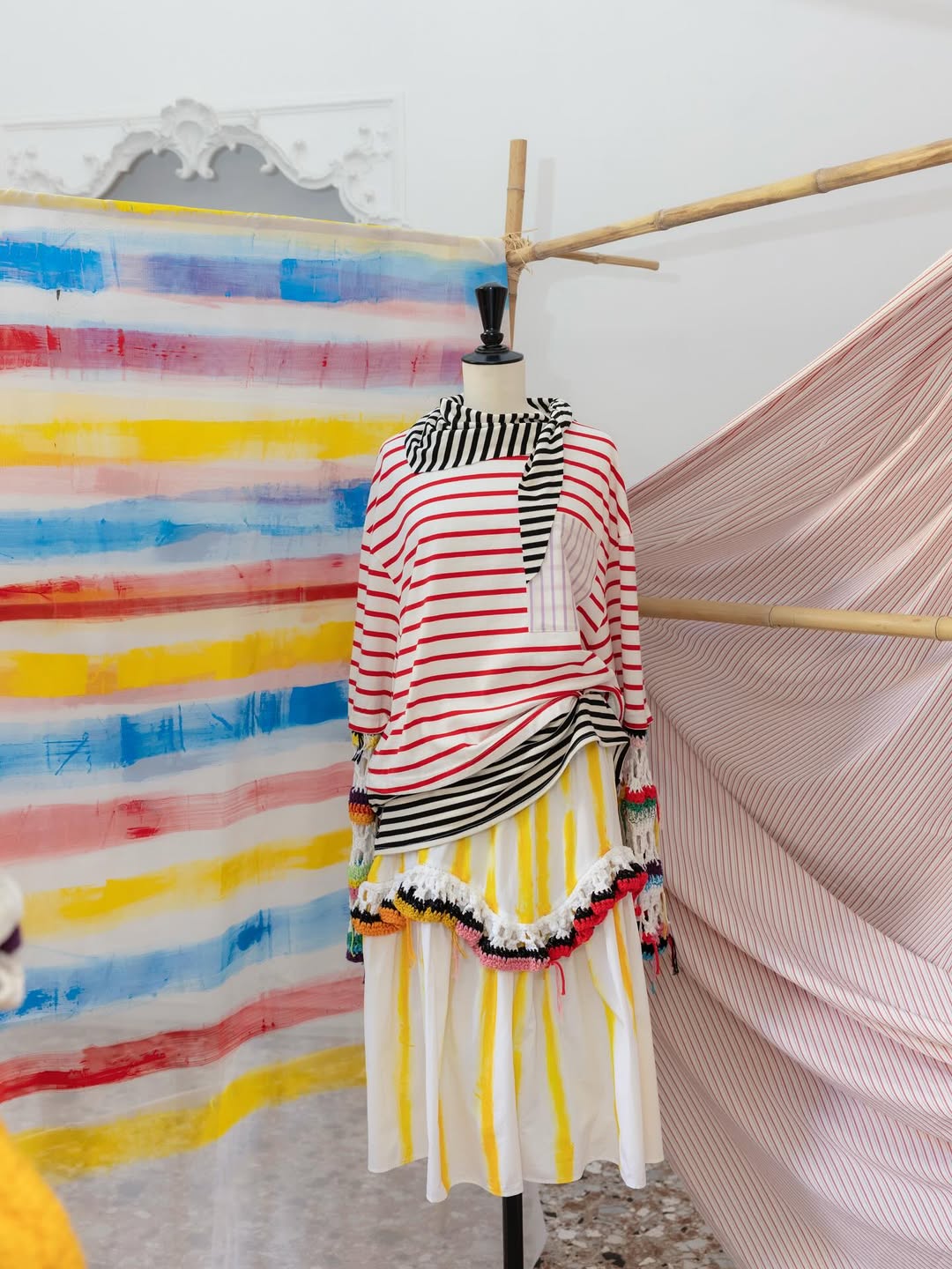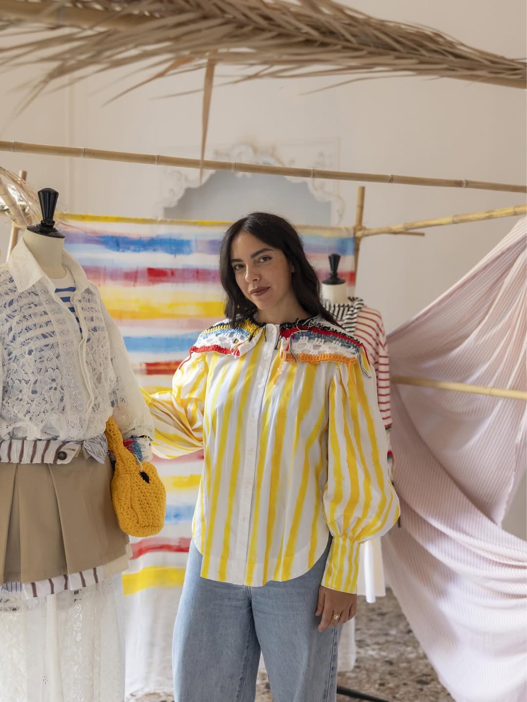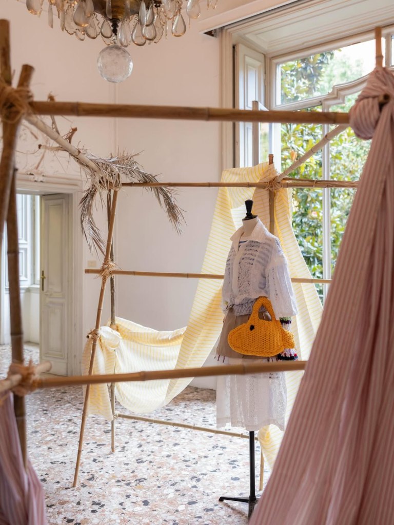 Martina di Cavia è quella persona che ogni volta che la incontri ti mette il buonumore (e mi ha promesso un aperitivo, per la cronaca). Ma torniamo a noi. La sua presentazione è stata un inno al “giocare a fare la capanna in spiaggia” – sì, proprio quella cosa che facevi da piccolo con teli, legnetti e sabbia quando stavi al mare. Una nostalgia calda che si traduce in capi soffici, colorati fuori ma coccolosi dentro. Come dire: fuori arcobaleno, dentro coperta della nonna.